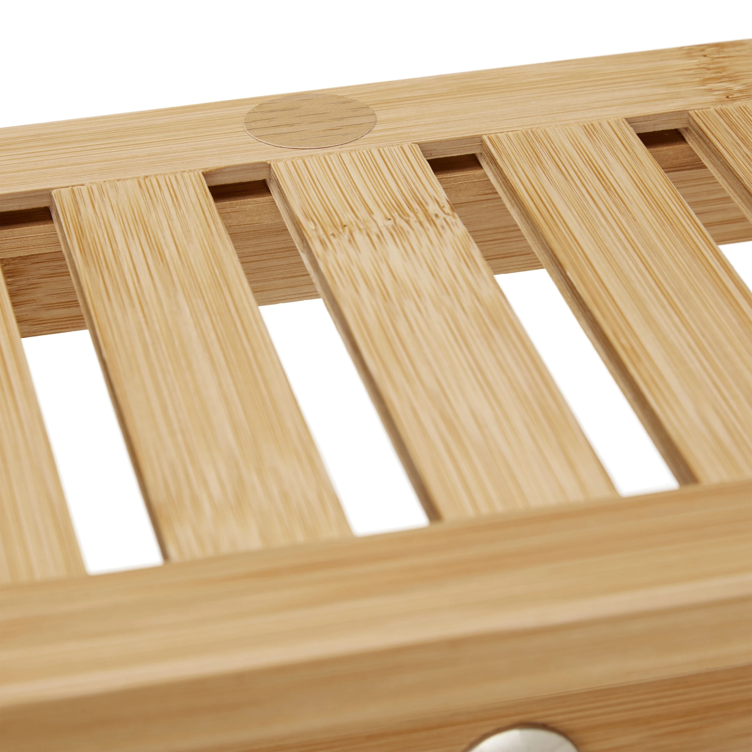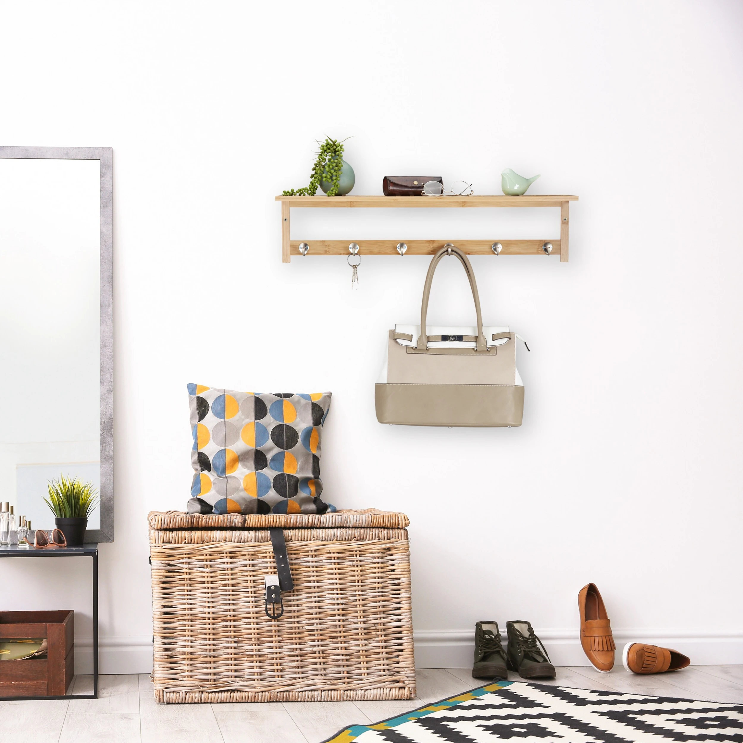 Dank diesem Wandregal mit Hakenleiste schaffen Sie auch im kleinsten Badezimmer wertvollen Stauraum. Die Ablage bietet Platz für frische Handtücher, Kosmetika oder auch Dekoartikel. An den 6 Haken aus Metall können Sie benutzte Handtücher oder auch Kleidungsstücke aufhängen. Das Wandbrett aus feuchtigkeitsbeständigem Bambus fügt sich mit seiner natürlichen Optik dezent in jedes Bad ein, eignet sich aber auch perfekt als platzsparende Wandgarderobe mit Ablage im Flur.