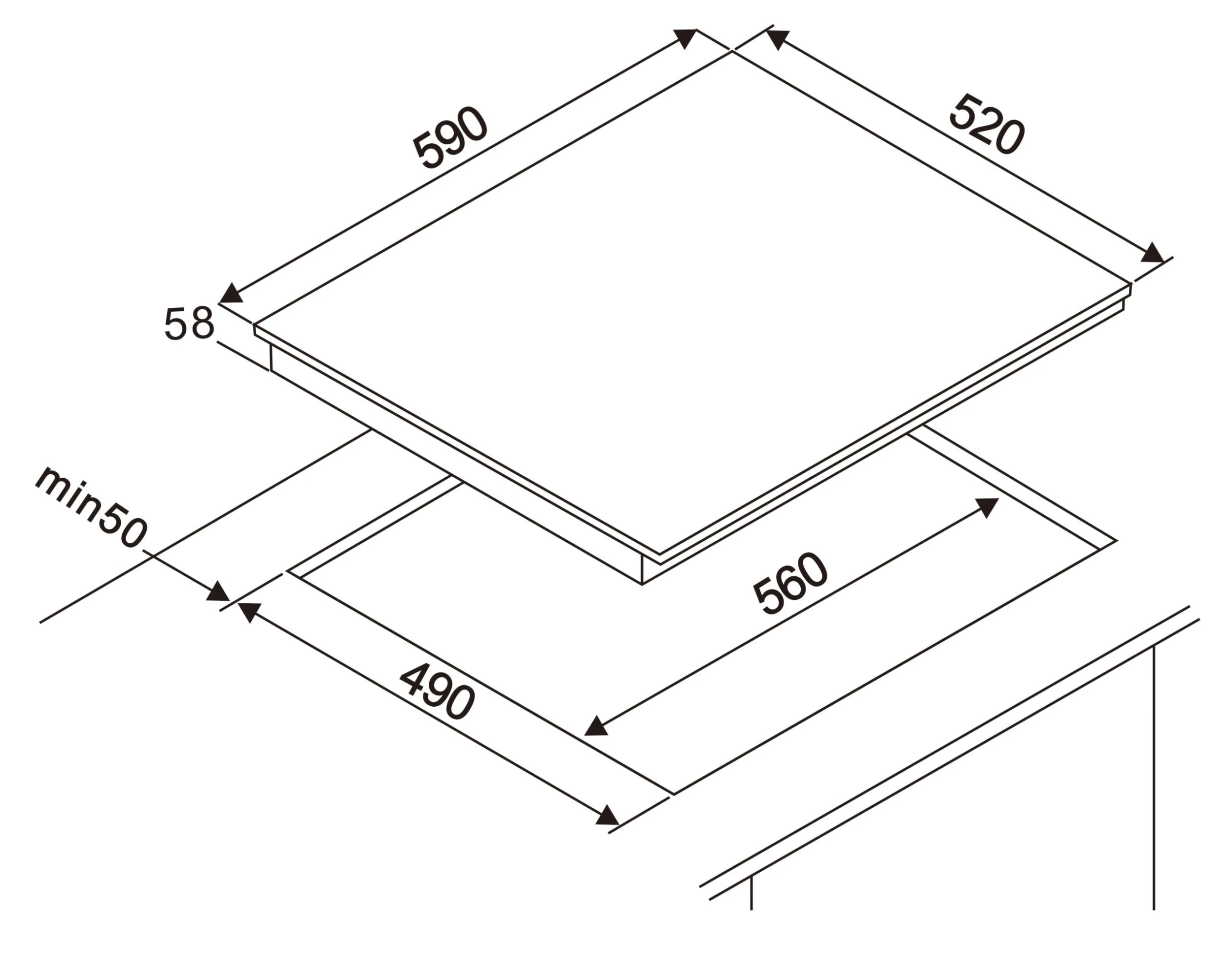 - Ausschnittmaße Kochfeld (H x B x T) 56 x 49 cm