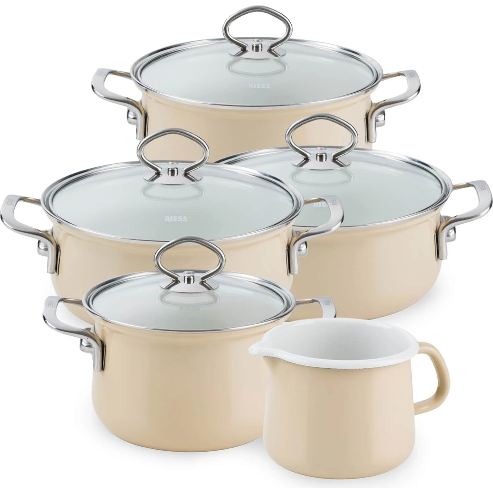 Set bestehend aus: Fleischtopf mit Glasdeckel 16 cm 1,5L, 20 cm 3,5L, Kasserolle mit Glasdeckel 16 cm 1L, 20 cm 2L, Schnabeltopf 12 cm 1L