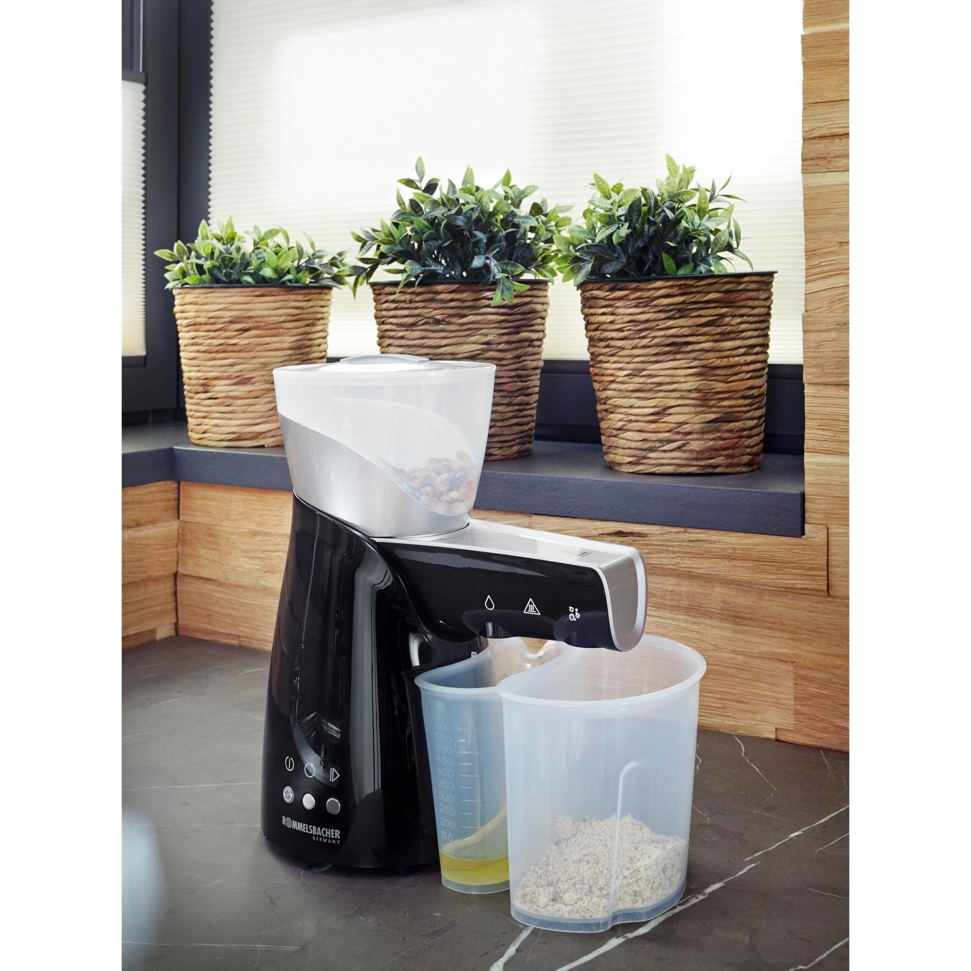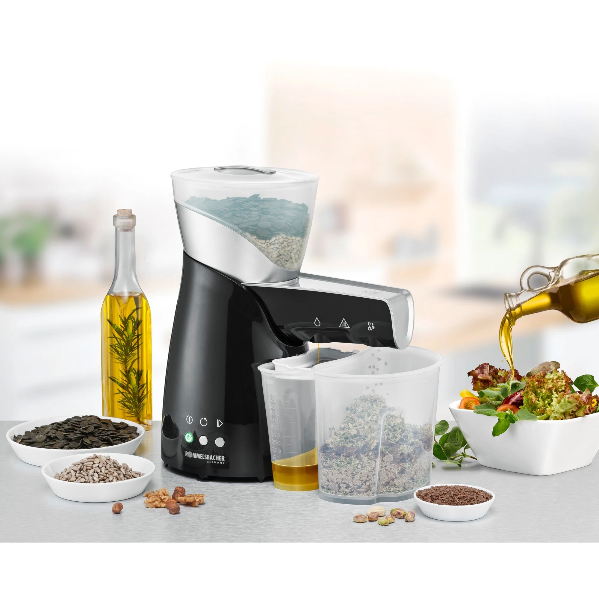 Die elektrische Ölpresse OP 700 von Rommelsbacher ist ideal, um sich jederzeit mit selbstgemachten, individuellen Ölen in Bioqualität zu versorgen. Gesunde Öle, selbst hergestellt aus Saaten, Kernen, Nüssen, sind wichtig für eine ausgewogene Ernährung, die auf künstliche Zusatzstoffe verzichtet. Auch für Naturkosmetik sind frische, selbstgepresste Öle eine hochwertige Basis. Dieses außergewöhnliche Gerät verfügt über zwei unterschiedliche Pressschnecken. Dadurch können zusätzlich zu allen gängigen Saaten und Kernen (wie z. B. Kürbiskerne, Erdnüsse, Pistazien) selbst kleinkörnige Sämereien wie beispielsweise Chia Samen optimal zu hochwertigen Ölen verarbeitet werden. Die Presse arbeitet im schonenden Kaltpressverfahren, was sicherstellt, dass alle Aromen, Vitamine und Nährstoffe im Öl erhalten bleiben. Wer Wert legt auf den unverfälschten Genuss hochwertiger, individueller Öle, der hat mit dieser elektrischen Presse den perfekten Experten gefunden.
