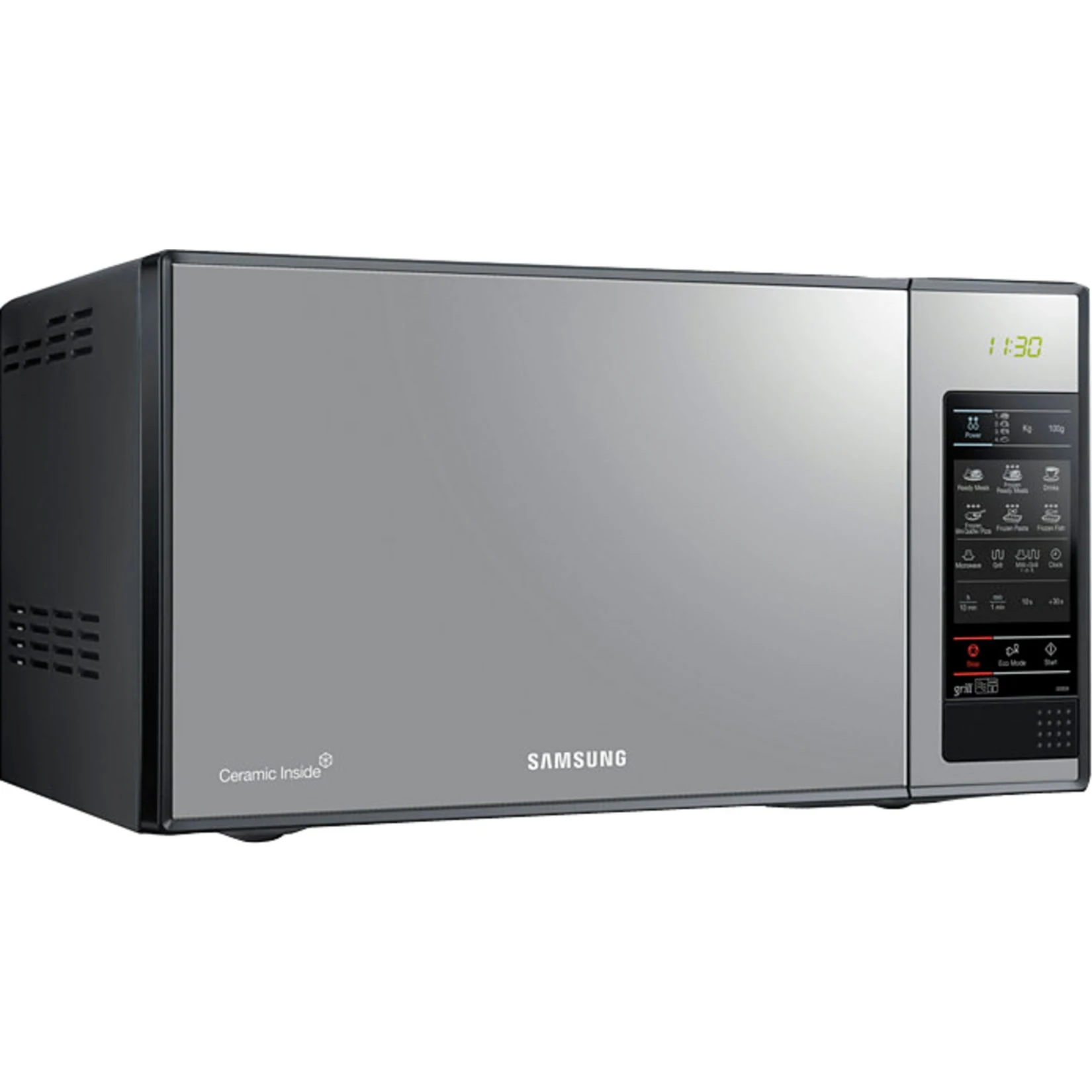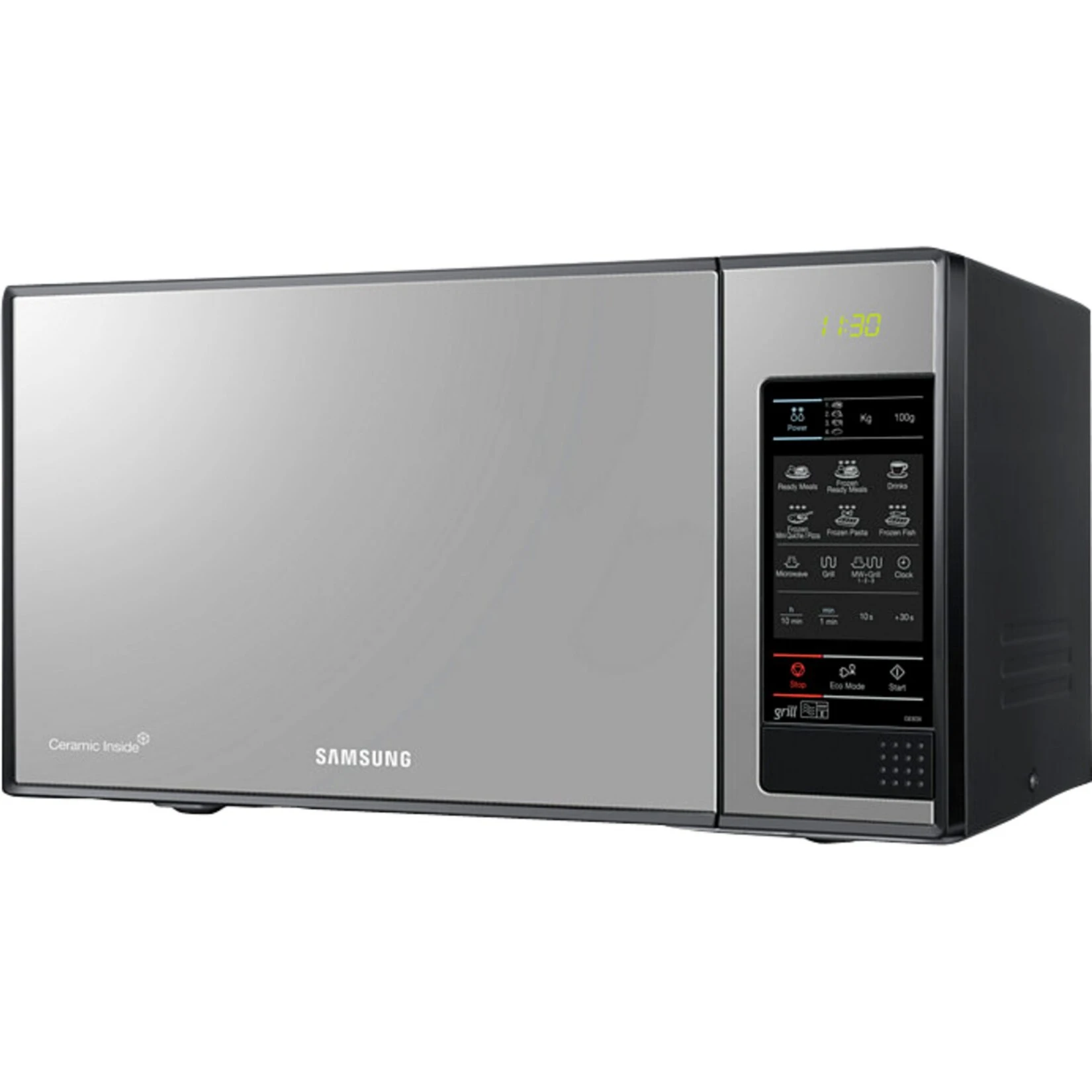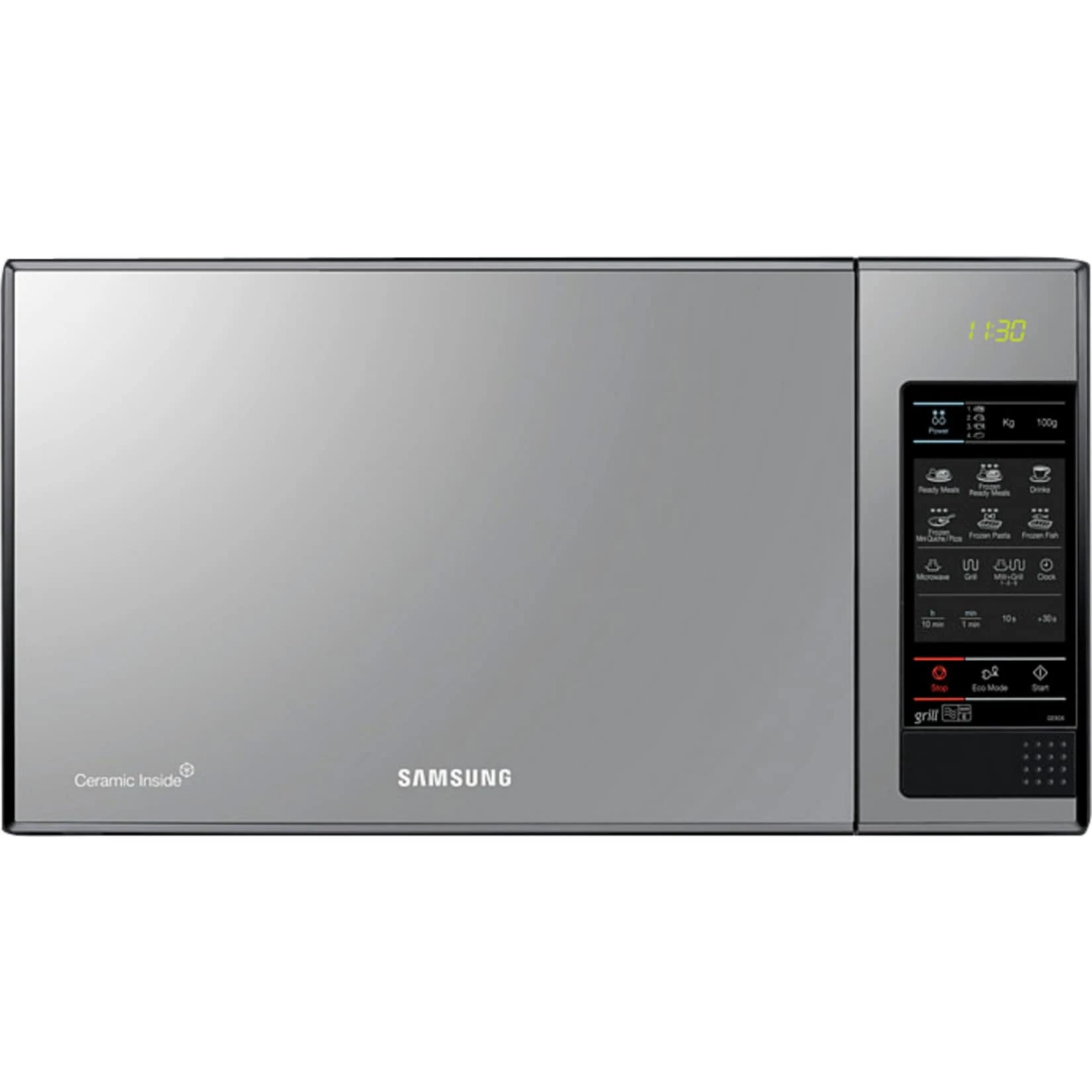 Die Samsung Mikrowelle GE83X überzeugt mit 23 Litern Nutzinhalt und Grillfunktion. Ihre Keramik-Innenbeschichtung sorgt für hohe Beständigkeit gegen Kratzer und verhindert, dass Gerüche und Geschmäcker aufgenommen und beim nächsten Kochvorgang übertragen werden. Außerdem haften Fett und Schmutz nicht an der glatten Oberfläche und lassen sich ohne zu schrubben mit einem feuchten Tuch abwischen. Die Uhrzeitanzeige der GE83X lässt sich im 12- oder 24-Stunden-System anzeigen. Für mehr Sicherheit sorgt die Kindersicherung.