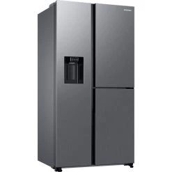 Der Side-by-Side Samsung RH68B8541S9/EG ist mit einem Gesamtnutzinhalt von 627 Litern optimal für den großen Familienhaushalt geeignet und überzeugt mit diversen Features. Im 403 Liter umfassende Kühlbereich haben frische Lebensmittel auf vier Abstellflächen, in zwei Obst-/Gemüseschubladen sowie in vier Türfächern jede Menge Platz, um übersichtlich gelagert zu werden. Die Food Showcase Tür ermöglicht einen schnellen und unkomplizierten Zugriff auf bevorzugte Getränke und Lebensmittel. Der Gefrierbereich mit NoFrost+ gegen Eis- und Reifbildung umfasst 224 Liter und ist ebenfalls mit vier Abstellflächen, zwei Gefriergutschubladen sowie zwei Türfächern ausgestattet. Zwei getrennte Kühlkreisläufe (Twin Cooling+) sorgen dafür, dass zwischen Kühl- und Gefrierbereich des RH68B8541S9/EG kein Luftaustausch stattfindet, wodurch die Geruchs- und Geschmacksübertragung von Kühl- in Gefrierteil reduziert wird und die trockene Luft im Gefrierteil nicht in den Kühlbereich gelangt. Die elegante Metall-Innenrückwand sorgt für eine gleichmäßige Innentemperatur bis in die letzte Ecke. Der platzsparende In-Door-Icemaker mit integriertem 4,5 Liter Wassertank bietet gekühltes Wasser, Eiswürfel und Crushed Ice auf Knopfdruck. Darüber hinaus überzeugt der RH68B8541S9/EG unter anderem mit den Funktionen PowerFreeze- und PowerCool, einer Urlaubsschaltung sowie einem Smart Sensor und einem Digital Inverter Kompressor. Mit einem Stromverbrauch von 343 kWh im Jahr ist der RH68B8541S9/EG in die Energieeffizienzklasse E eingestuft.
