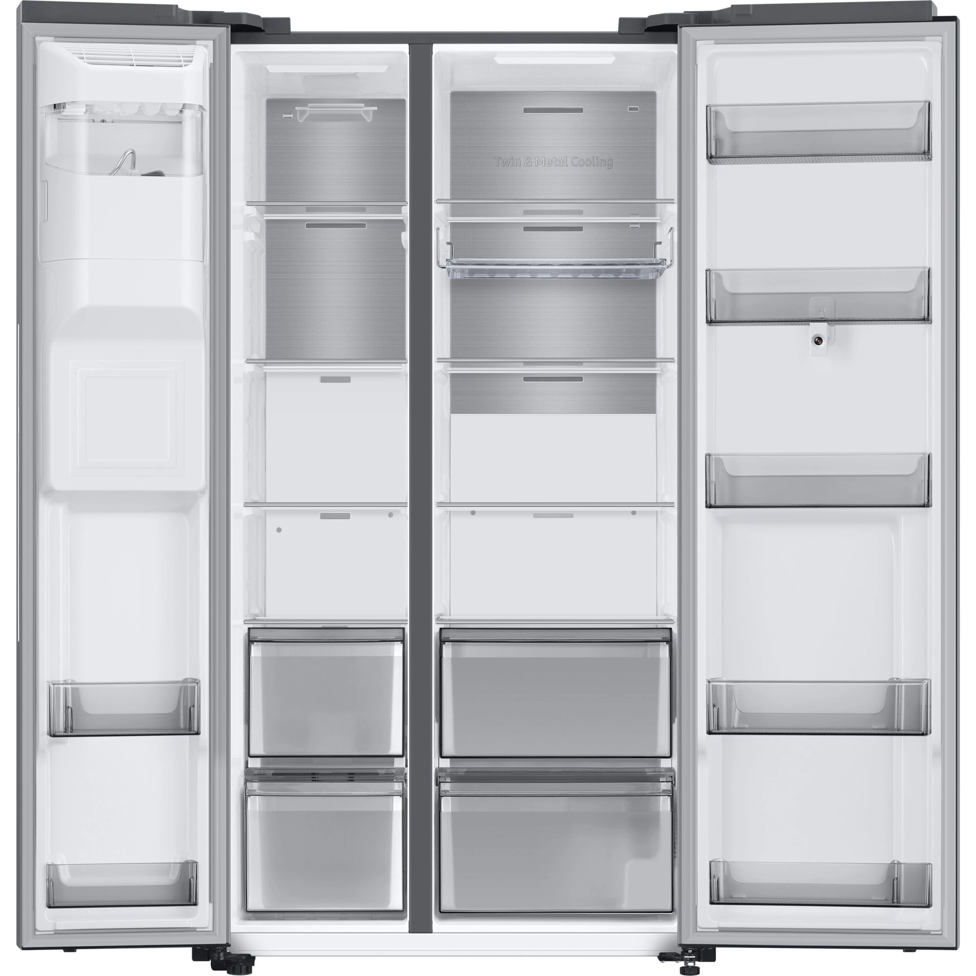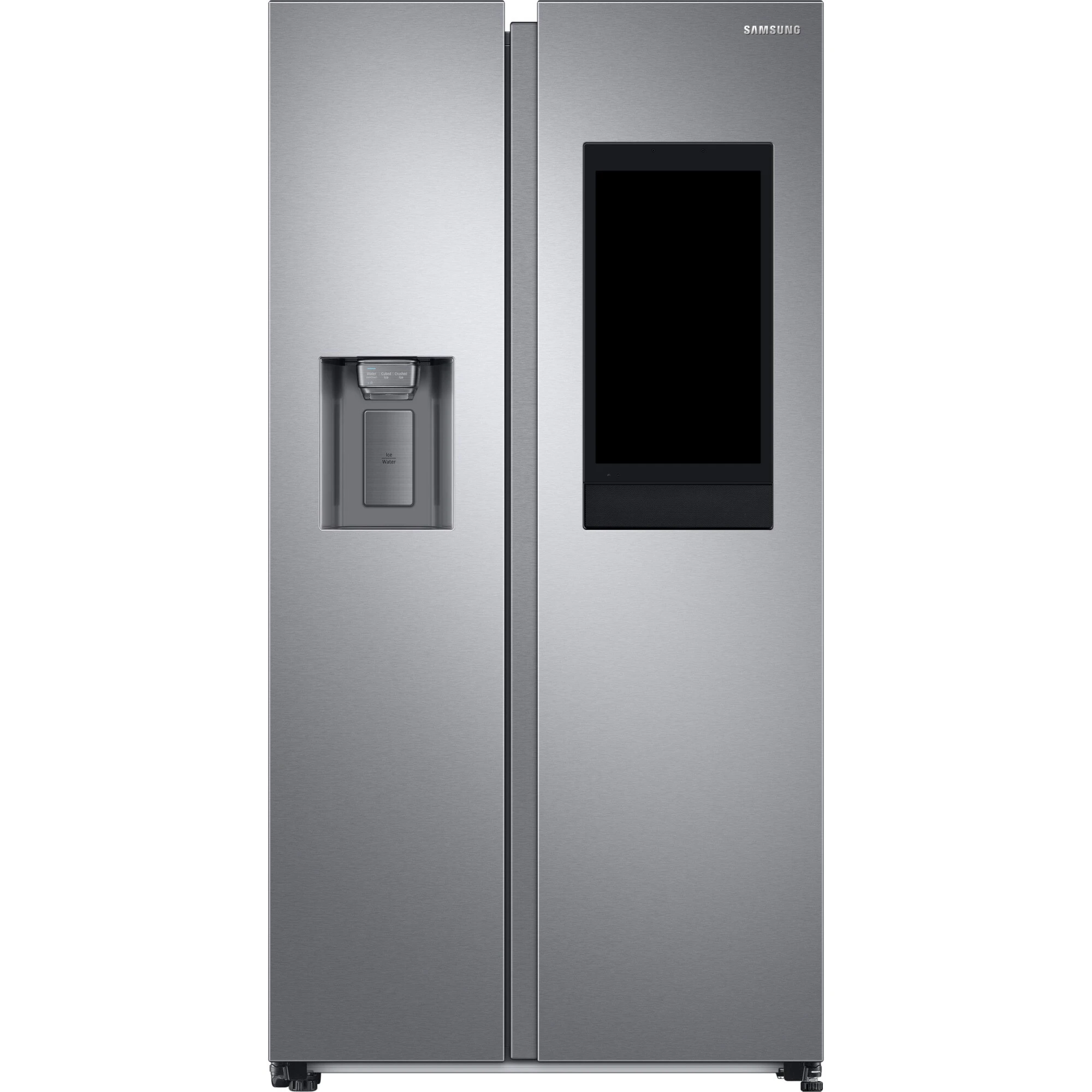 Der Side-by-Side Samsung RS6HA8891SL/EG ist mit einem Gesamtnutzinhalt von 614 Litern optimal für den großen Familien-Haushalt geeignet und überzeugt mit zahlreichen Features. Die Kamera im Inneren des Kühlteils zeigt jederzeit und überall die gekühlten Lebensmittel auf kompatiblen Mobilgeräten an, sodass man selbst beim Einkaufen oder von unterwegs einen raschen Blick in den Kühlschrank werfen kann. Auch lassen sich Inhalte von kompatiblen Fernsehern oder Smartphones direkt auf den Family Hub streamen, damit Lieblingssendungen oder Urlaubsfotos auf dem 54,61 cm (21,5″) großen FHD-Touchscreen direkt in der Küche erscheinen und sich komfortabel bedienen lassen. Der 389 Liter umfassende Kühlbereich des RS6HA8891SL/EG ist mit vier Abstellflächen, zwei Obst-/Gemüseschubladen sowie fünf Türfächern für die übersichtliche Lagerung frischer Lebensmittel ausgestattet. Der Gefrierbereich mit NoFrost+-Technologie gegen Eis- und Reifbildung umfasst 225 Liter und stellt ebenfalls vier Abstellflächen, zwei Gefriergutschubladen sowie zwei Türfächer zur Verfügung. Für den besonderen Komfort sorgt der In-Door Icemaker mit Festwasseranschluss für Wasser, Eiswürfel und Crushed Ice. Darüber hinaus bietet der RS6HA8891SL/EG die Funktionen Power Freeze und Power Cool, eine Urlaubsschaltung sowie einen Smart Sensor, Twin Cooling+ und Metal Cooling. Mit einem Stromverbrauch von 346 kWh im Jahr ist der RS6HA8891SL/EG in die Energieeffizienzklasse E eingestuft.