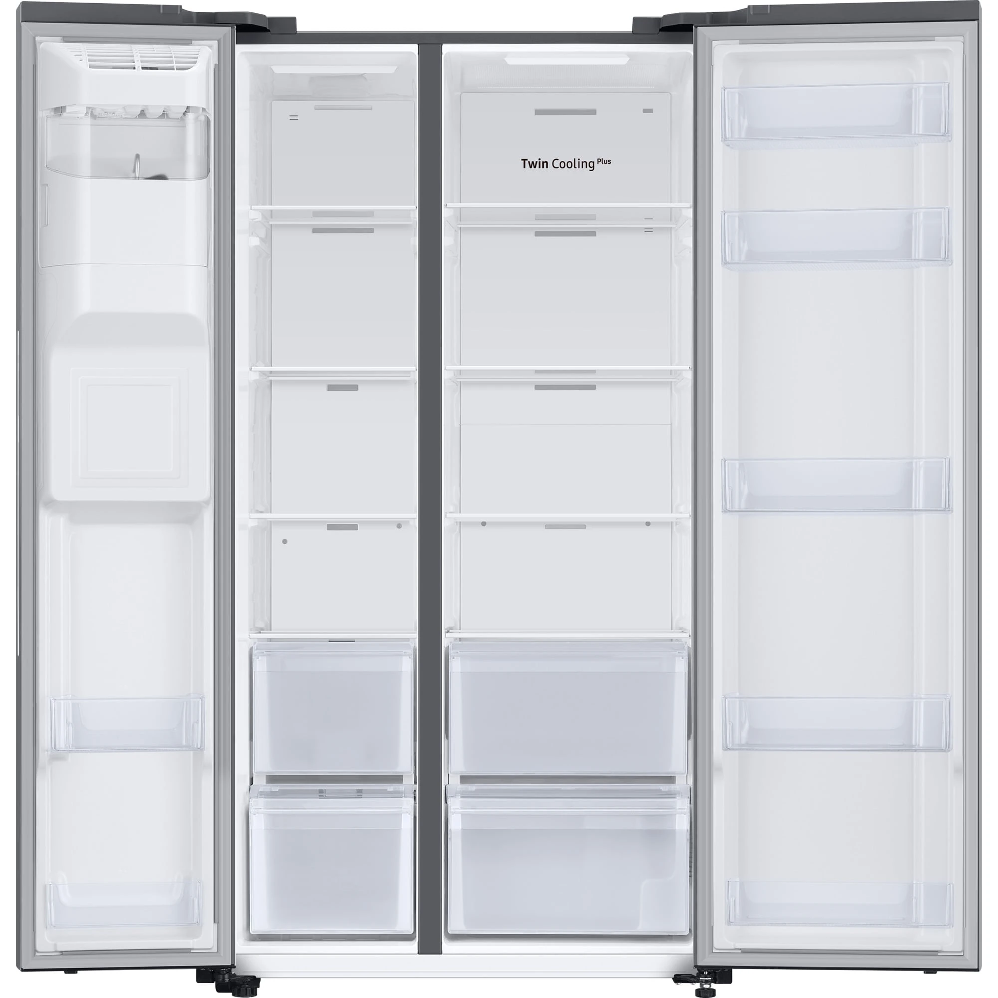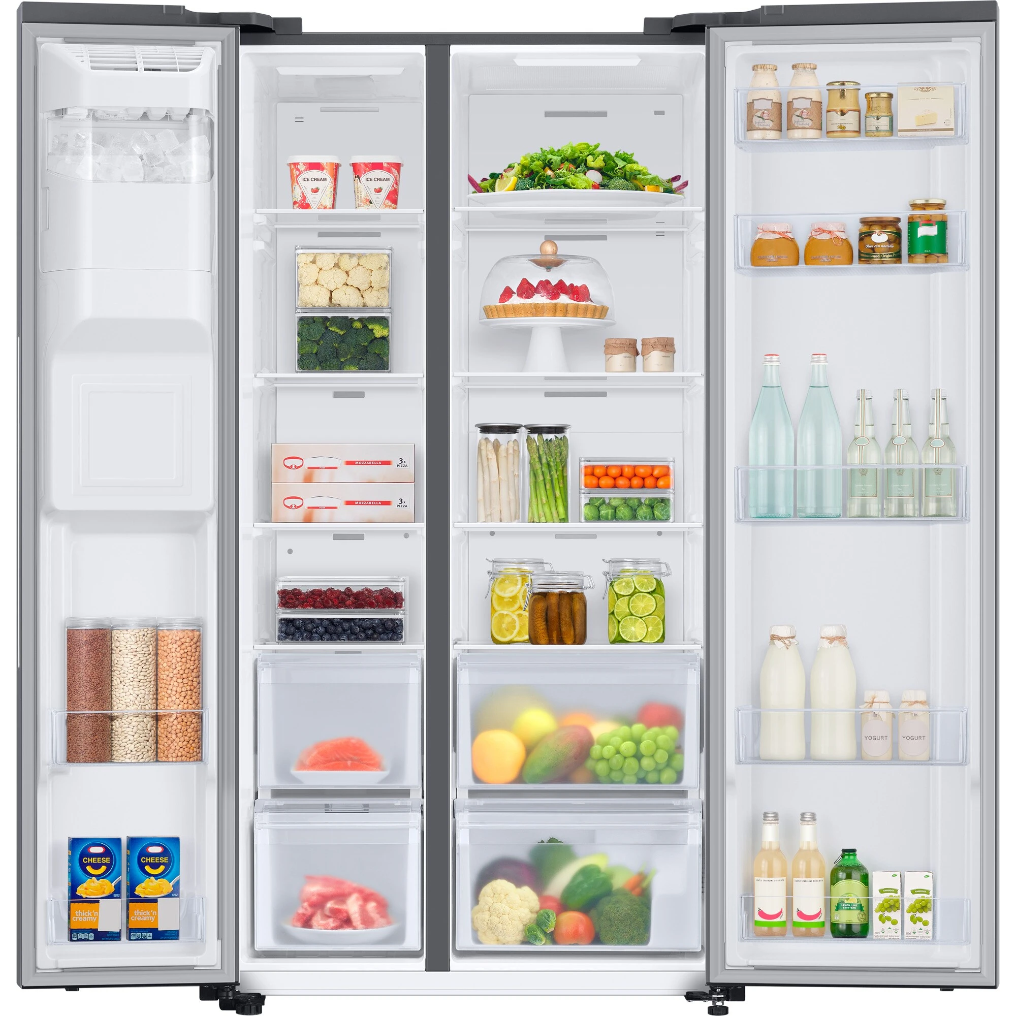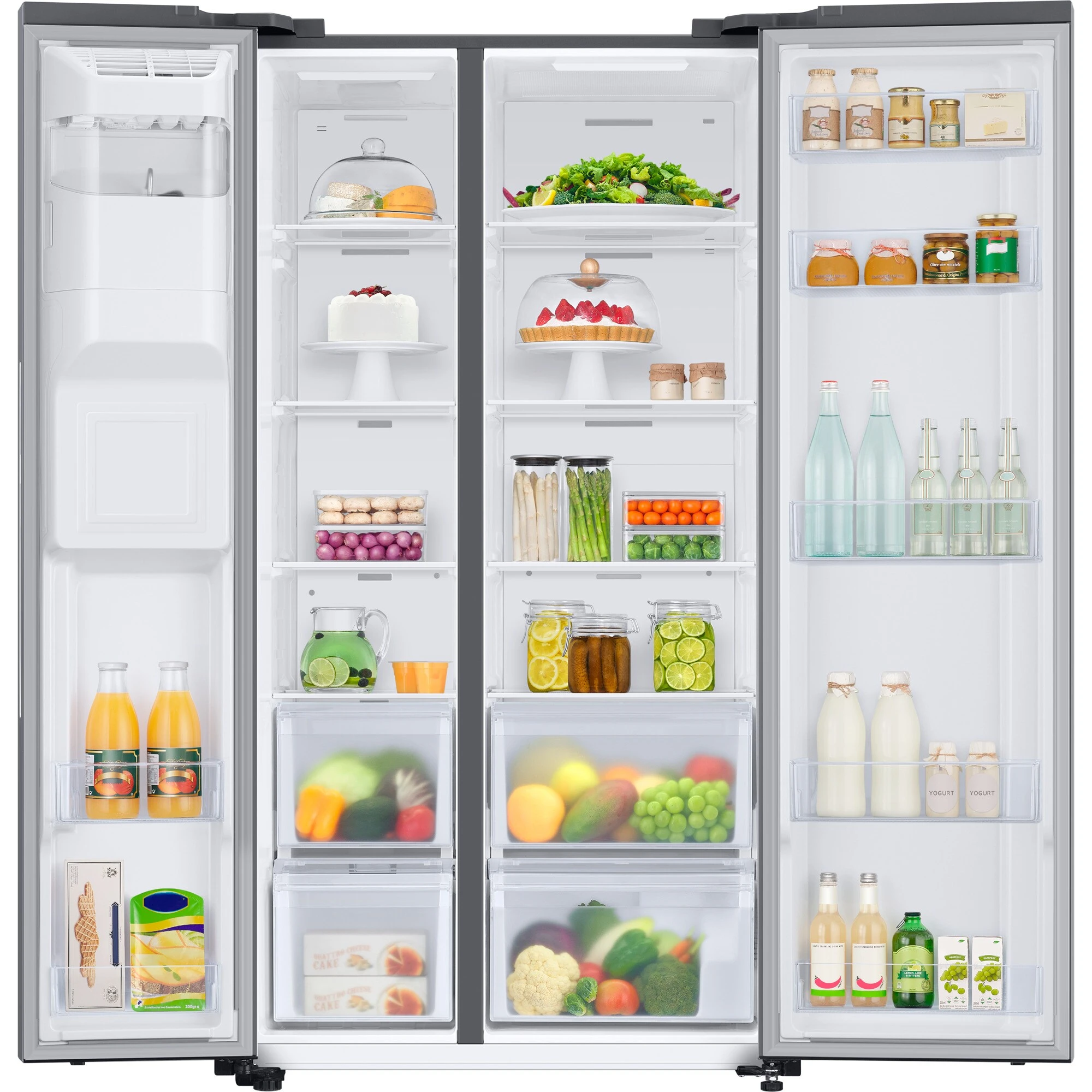 Der Side-by-Side Samsung RS6JA8810S9/EG ist mit einem Gesamtnutzinhalt von 634 Litern optimal für den großen Haushalt geeignet und überzeugt mit diversen Features. Im 409 Liter umfassende Kühlbereich mit Multi-Airflow-System haben frische Lebensmittel auf vier Abstellflächen, in zwei Obst-/Gemüseschubladen sowie in fünf Türfächern jede Menge Platz, um übersichtlich gelagert zu werden. Der Gefrierbereich mit NoFrost+ gegen Eis- und Reifbildung umfasst 225 Liter und ist mit zwei Gefriergutschubladen sowie vier Abstellflächen und fünf Türfächern ausgestattet. Darüber hinaus überzeugt der RS6JA8810S9/EG unter anderem mit PowerFreeze- PowerCool-Funktion, Urlaubsschaltung und Smart Sensor. Mit einem Stromverbrauch von 395 kWh im Jahr ist der RS6JA8810S9/EG in die Energieeffizienzklasse F eingestuft.