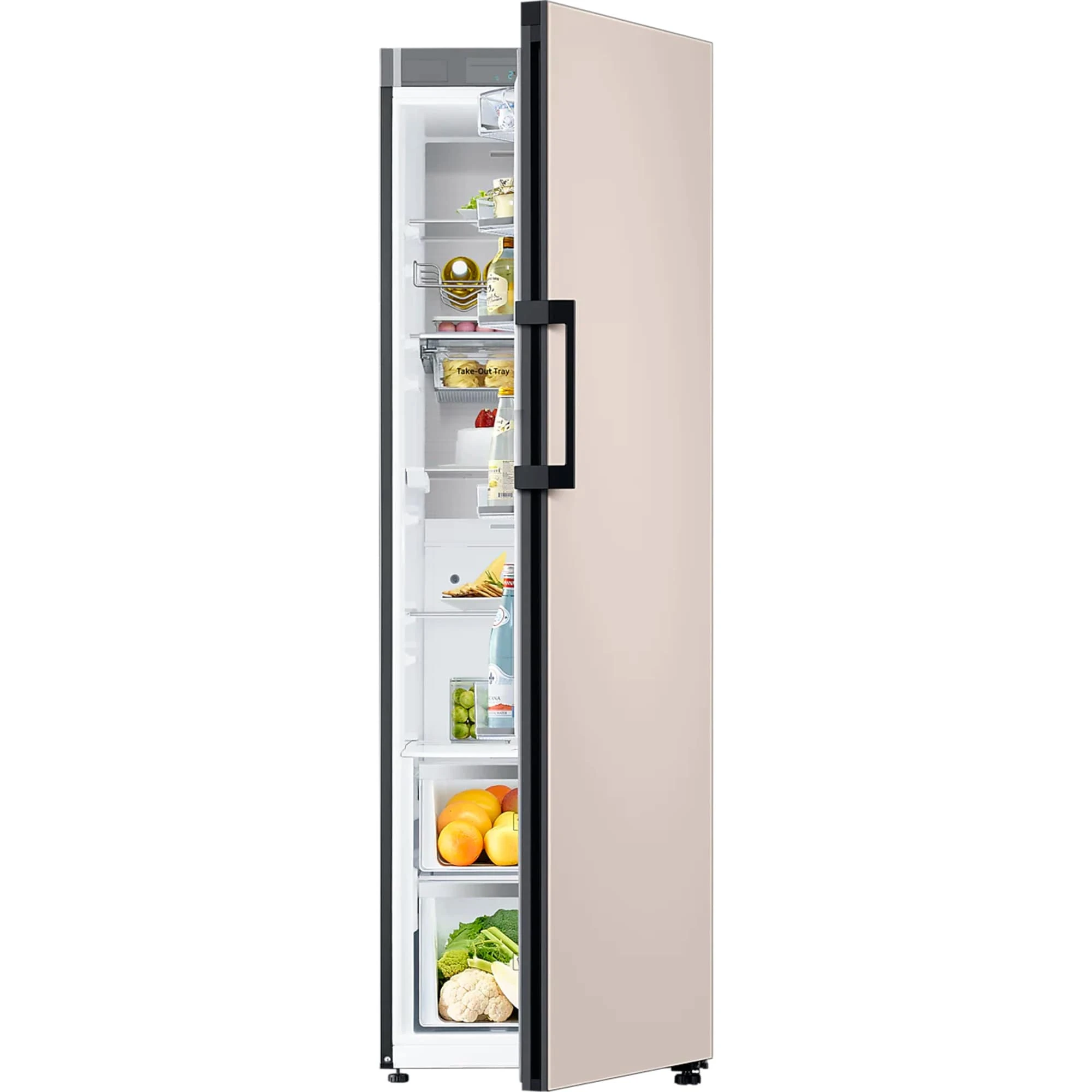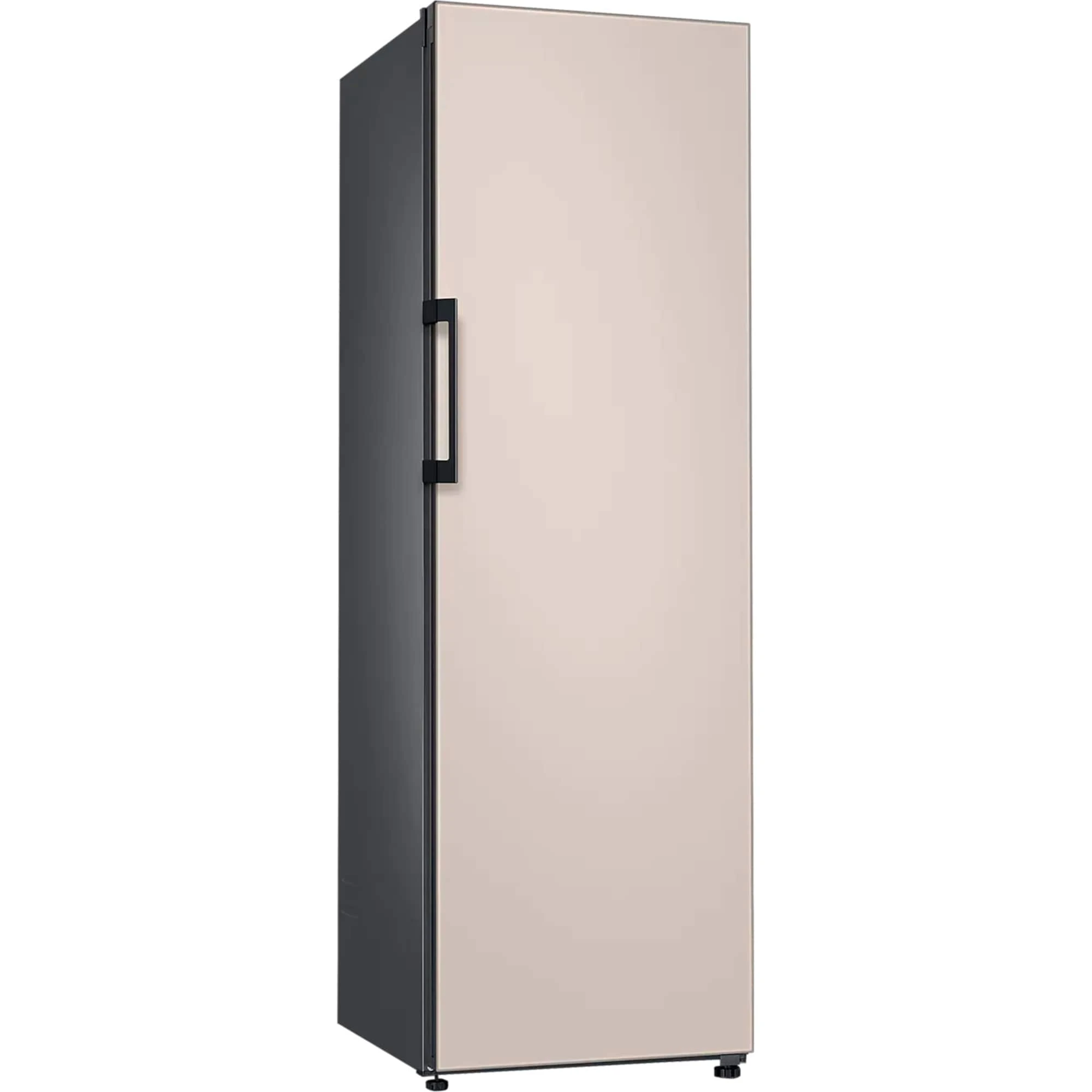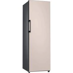 Der Vollraumkühlschrank Bespoke RR39A746339/EG von SAMSUNG bietet einen Gesamtnutzinhalt von 387 Litern und besticht durch sein stilvoll-minimalistisches und modulares Design. Er stellt sechs Abstellflächen, davon ein ein- bzw. ausschiebbares Slide-in Shelf, zwei Obst-/Gemüseschubladen mit Humidity Control sowie sieben Türfächer für die übersichtliche Lagerung frischer Lebensmittel zur Verfügung. Das transparente Take-out-Tray wurde speziell für die Aufbewahrung von Milchprodukten, Joghurt, Desserts, Fingerfood und Weinflachen entwickelt. Die gleichbleibende Kühlung auf jeder Ebene des RR39A746339/EG wird unterstützt durch All-Around Cooling – ein ausgeklügeltes System zur Belüftung, welches die Temperatur im gesamten Kühlraum auf ein gleichmäßiges Niveau herunterregelt. Die elegante Metall-Innenrückwand sorgt für eine gleichmäßige Innentemperatur, zudem wird die gewünschte Temperatur durch die in der Metallplatte gespeicherte Kälte nach dem Öffnen und Schließen der Tür schnell wieder erreicht. Die Temperaturregelung und Funktionssteuerung erfolgt über das Innenliegende Display. Mit einem Stromverbrauch von 120 kWh im Jahr ist der RR39A746339/EG in die Energieeffizienzklasse E eingestuft.