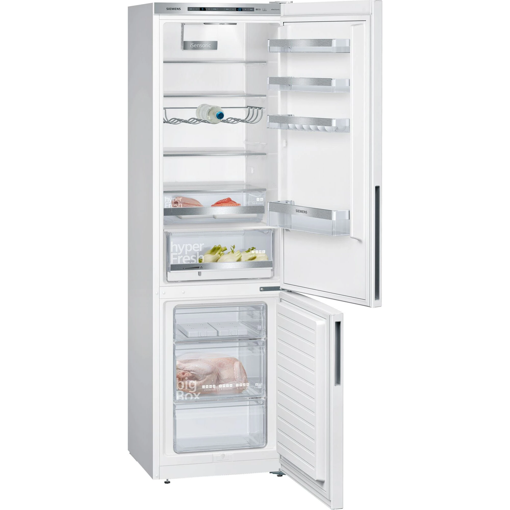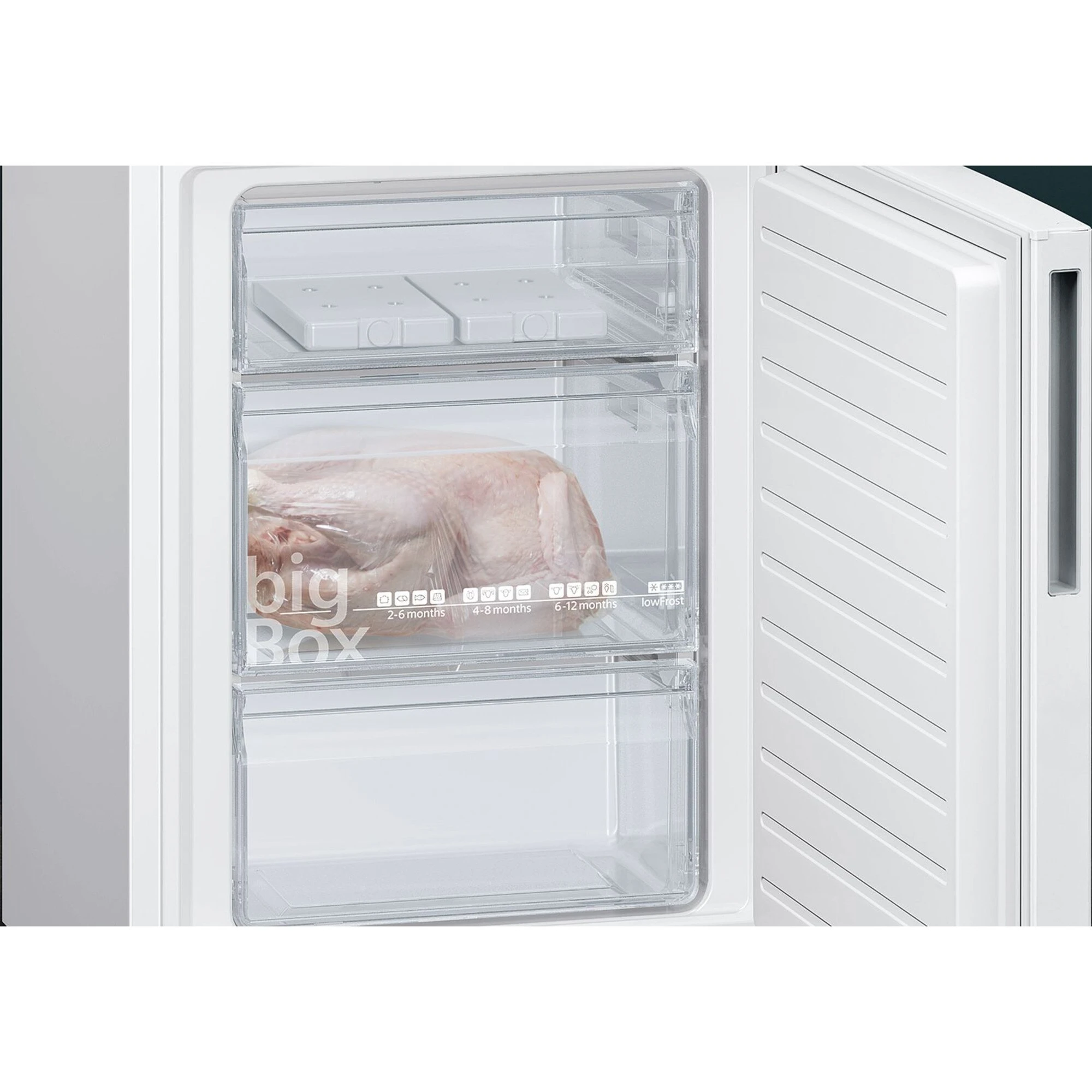 Die Kühl-/Gefrierkombination Siemens KG39EAWCA ist mit einem Gesamtnutzinhalt von 343 Litern ideal für den mittelgroßen Haushalt geeignet. Im 249 Liter umfassende Kühlbereich haben frische Lebensmittel auf fünf Abstellflächen aus Sicherheitsglas, davon zwei höhenverstell- und vier ausziehbar, in einer hyperFresh Obst-/Gemüseschublade mit Feuchteregelung und einer hyperFresh 0°C Box für Fisch und Fleisch sowie in vier Türfächern jede Menge Platz um übersichtlich gelagert zu werden. Mit der Taste superCooling werden die Temperaturen im Kühlraum schnell auf +2 °C gesenkt, was beim Einlagern von wärmeren Lebensmitteln in den Kühlraum einen unerwünschten Temperaturanstieg bereits gut gekühlter Speisen verhindert. Der Gefrierbereich der KG39EAWCA umfasst 94 Liter und ist mit drei transparenten Gefriergutschubladen, davon eine BigBox, ausgestattet. LowFrost reduziert die Eisbildung, sodass man den Gefrierraum deutlich seltener abtauen muss. Die Temperaturregelung der KG39EAWCA erfolgt getrennt für Kühl- und Gefrierbereich und ist digital exakt ablesbar. Mit einem Stromverbrauch von 149 kWh im Jahr ist die KG39EAWCA in die Energieeffizienzklasse C eingestuft.