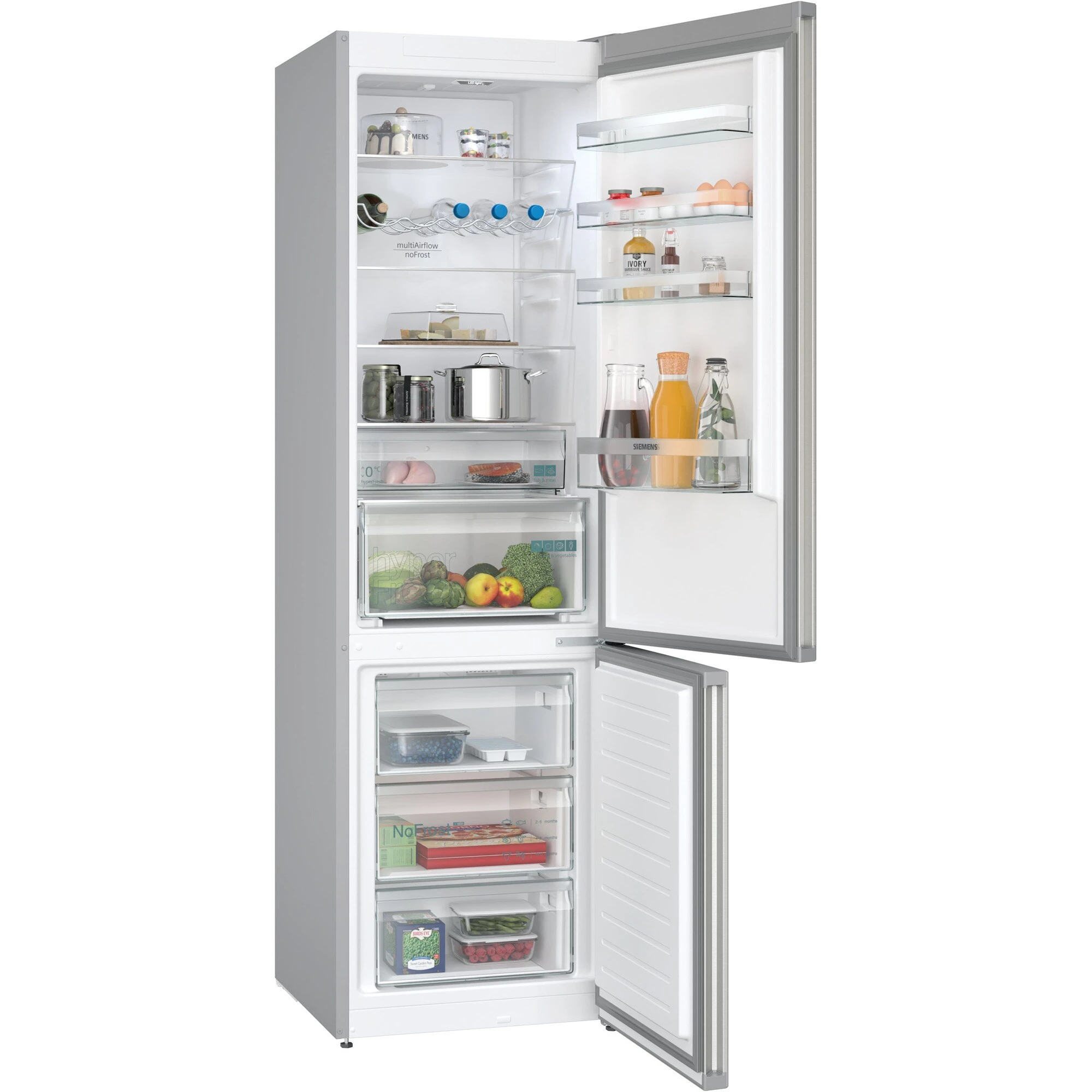 Die Kühl-/Gefrierkombination Siemens KG39NXIBF ist mit einem Gesamtnutzinhalt von 363 Litern ideal für den großen Haushalt geeignet und bietet viel Komfort. Im 260 Liter umfassenden Kühlbereich haben frische Lebensmittel auf fünf Abstellflächen aus Sicherheitsglas, davon drei höhenverstell- und vier ausziehbar, in einer hyperFresh Box mit Feuchteregelung für Obst und Gemüse und einer hyperFresh 0°C Box sowie in vier Türfächern jede Menge Platz. Die superKühlen-Funktion kühlt neu eingelegte Lebensmittel schneller und bietet so Schutz für bereits eingelagerte Speisen. Der Gefrierbereich umfasst 103 Liter und ist mit drei transparenten Gefriergutschubladen ausgestattet. Dank der noFrost-Technologie gegen Eisbildung muss der Gefrierraum nie wieder mühsam abgetaut werden. Die Temperaturregelung der KG39NXIBF erfolgt elektronisch getrennt für jede Temperaturzone mittels und ist über LED ablesbar. Mit einem Stromverbrauch von 129 kWh im Jahr ist die KG39NXIBF in die Energieeffizienzklasse B eingestuft.