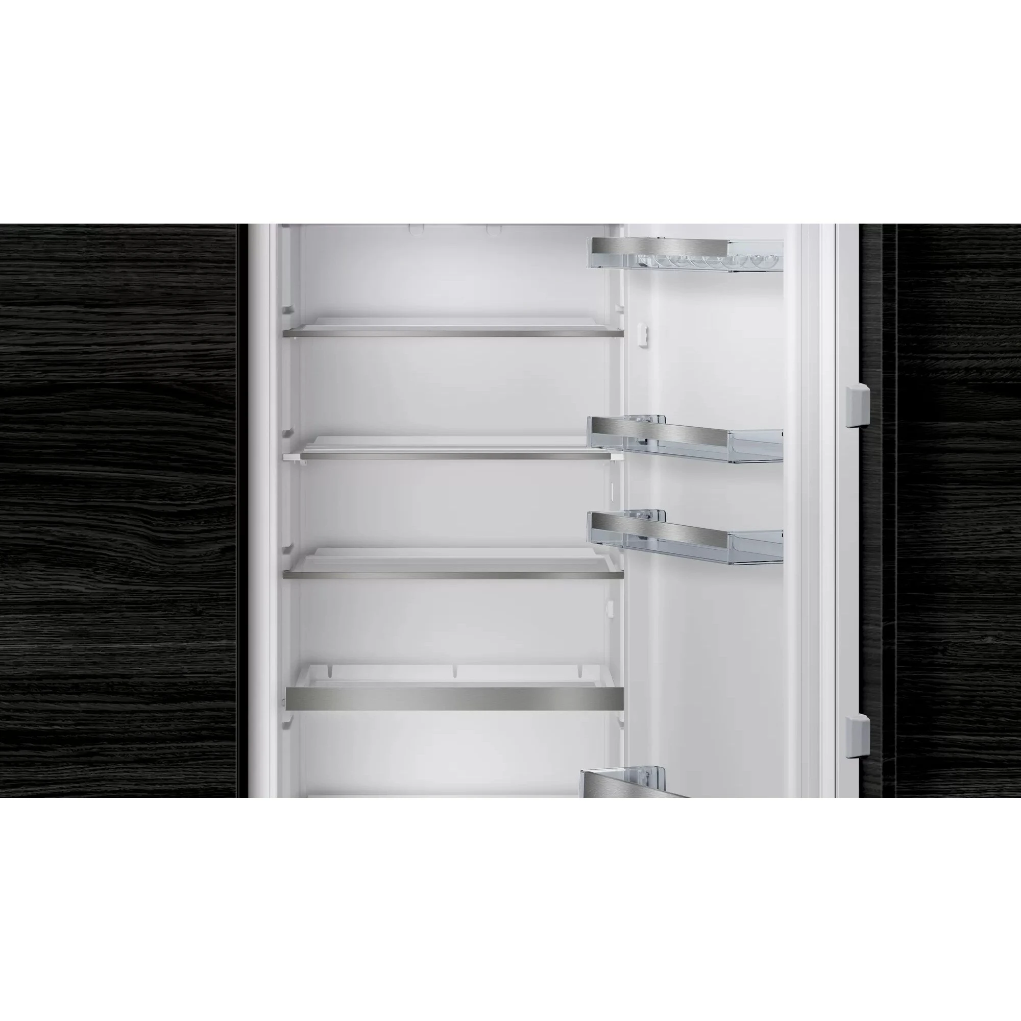 Der vollintegrierbare Kühlschrank Siemens KI52LADE0 stellt einen Gesamtnutzinhalt von 228 Litern zur übersichtlichen Lagerung frischer Lebensmittel zur Verfügung. Ausgestattet ist er mit fünf Abstellflächen aus Sicherheitsglas, davon vier höhenverstellbar und eine ausziehbar, fünf Türfächern, davon ein Butter-/Käsefach, sowie einer hyperFresh plus Box, die Obst und Gemüse bis zu zweimal länger frisch und knackig hält. Das 4-Sterne-Gefrierfach mit Klappe bietet einen Nutzinhalt von 15 Litern und friert innerhalb von 24 Stunden bis zu 2,5 Kilogramm an Lebensmitteln ein. Die intelligente Sensortechnik FreshSense sorgt im gesamten Kühlraum für eine konstante Temperatur und dank der softClosing-Tür ist der KI52LADE0 stets ordnungsgemäß und vollständig geschlossen. Mit der SuperKühlen-Funktion wird die Temperatur für eine eingestellte Zeit gesenkt, sodass beim Einlagern wärmerer Lebensmittel ein unerwünschter Temperaturanstieg bereits gekühlter Speisen verhindert wird. Mit einem Stromverbrauch von 151 kWh im Jahr ist der KI52LADE0 in die Energieeffizienzklasse E eingestuft.