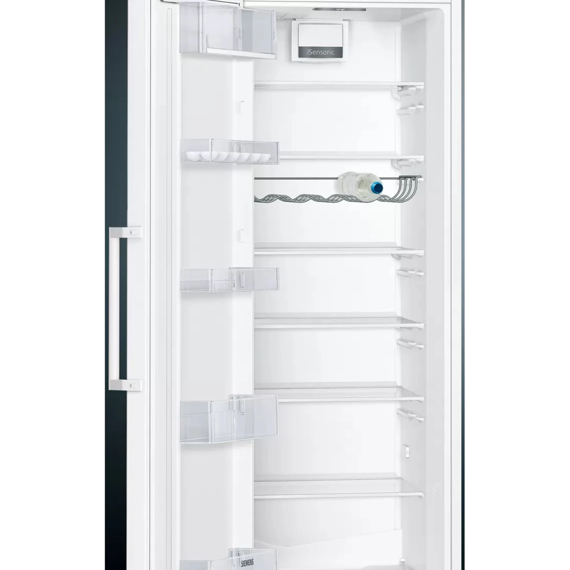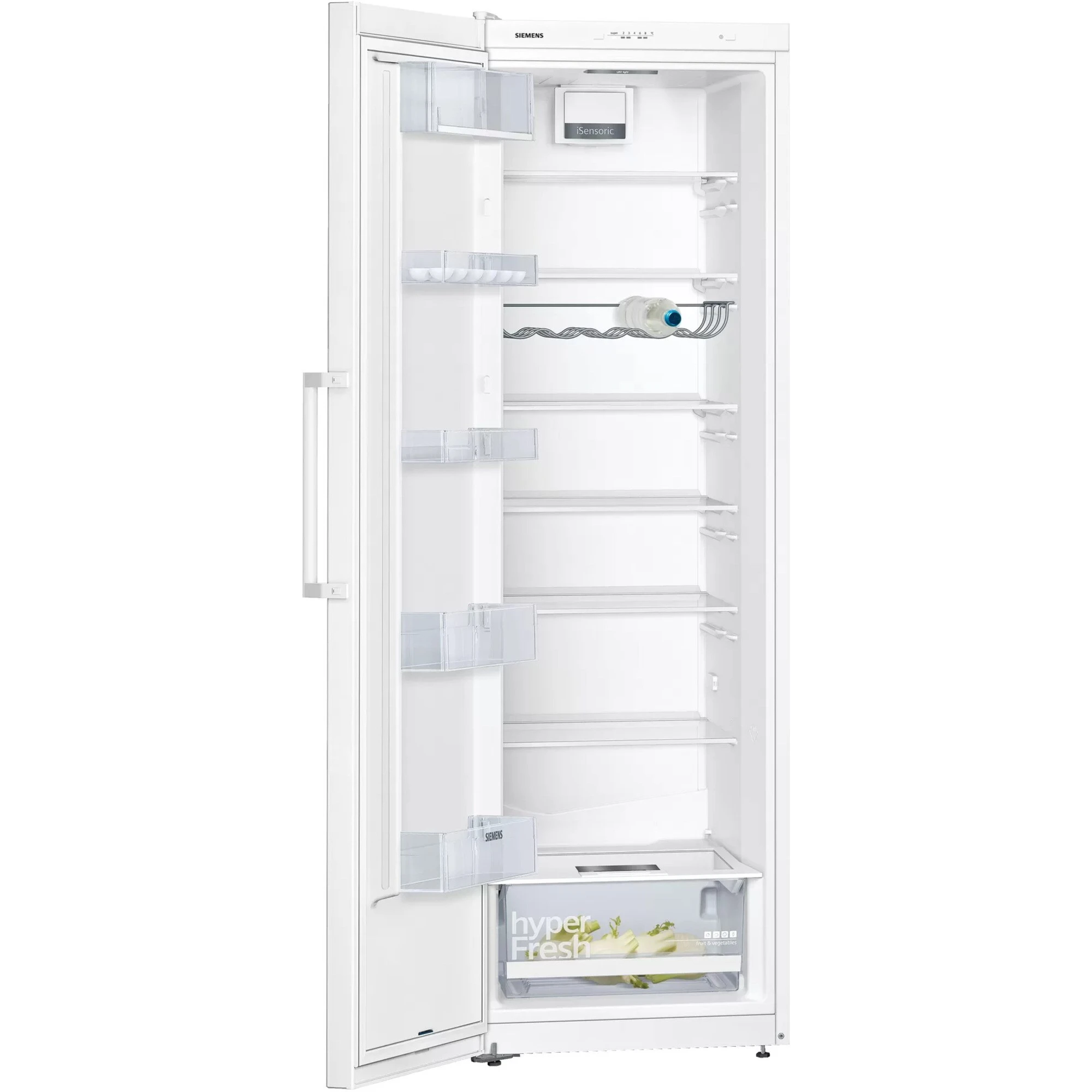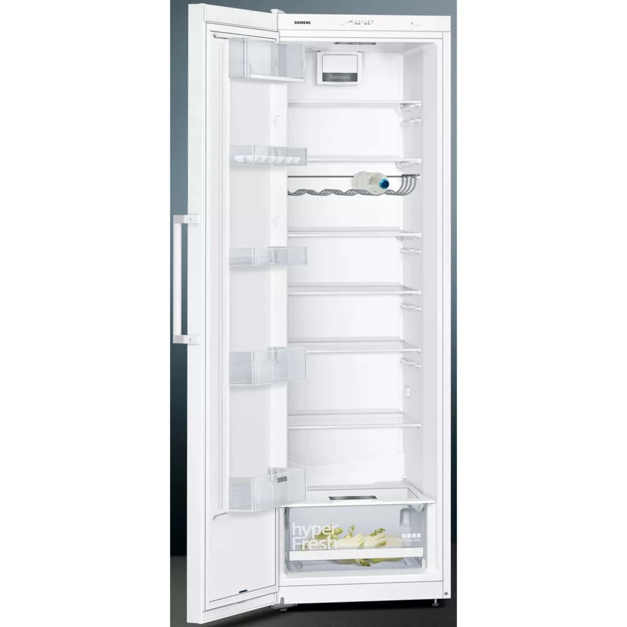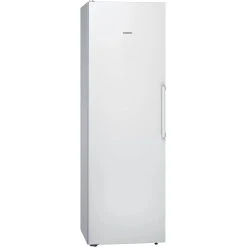 Der Kühlschrank Siemens KS36VVWEP stellt einen großzügigen Gesamtnutzinhalt von 346 Litern zur übersichtlichen Lagerung frischer Lebensmittel zur Verfügung. Ausgestattet ist er mit sieben Abstellflächen aus Sicherheitsglas, davon fünf höhenverstell- und sechs ausziehbar, sowie einem verchromten Flaschenrost und fünf Türfächern, davon ein Butter-/Käsefach. In der hyperFresh Box mit Feuchteregelung bleibt Obst und Gemüse länger frisch und knackig. Die intelligente Sensortechnik FreshSense sorgt im gesamten Kühlraum für eine konstante Temperatur und mit der SuperKühlen-Funktion wird die Temperatur für eine eingestellte Zeit gesenkt, sodass beim Einlagern wärmerer Lebensmittel ein unerwünschter Temperaturanstieg bereits gekühlter Speisen verhindert wird. Mit einem Stromverbrauch von 116 kWh im Jahr ist der KS36VVWEP in die Energieeffizienzklasse E eingestuft.
