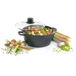 Dieser Topf aus hohwertigem Aluguss aus der Serie “Leipzig”, mit der langlebigen Antihaft-Versiegelung Greblon C2+ der Firma Weilburger garantiert eine besonders gute Wärmespeicherung, wodurch Ihre Speisen lange warm bleiben. Der praktische Glasdeckel ermöglicht ein energiesparendes Garen. Die Töpfe in schwerer Qualität sind sehr robust und leicht zu reinigen. Zu jedem Topf gehören ein Paar Thermogrips, welche es ermöglichen, diesen auch nach dem Gebrauch im Backofen, gefahrlos und ohne sich zu verbrennen zu transportieren. Die Griffe sind backofenfest bis 180°C. Die Töpfe der Serie Leipzig sind nicht induktionsgeeignet.