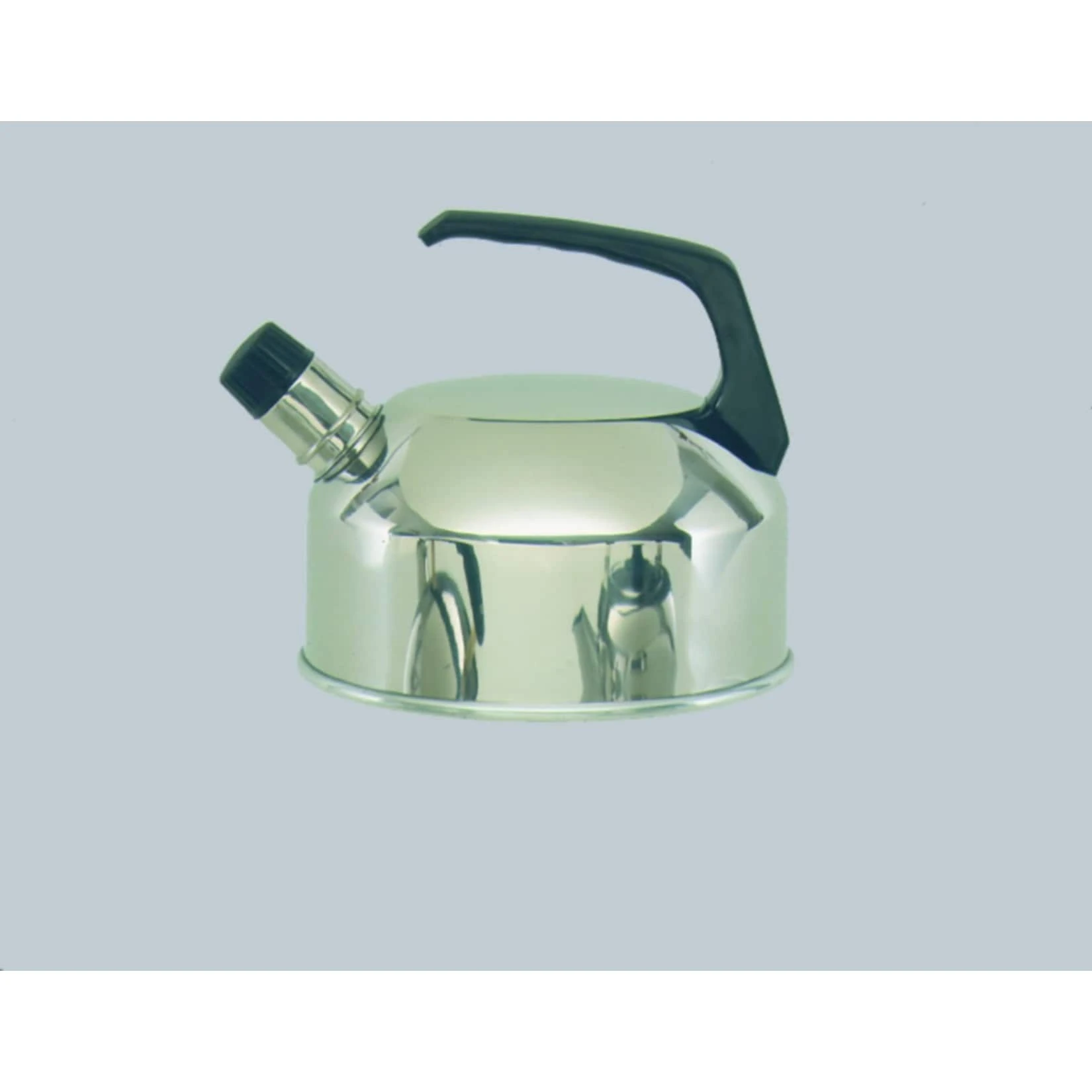 Flötenkessel Modell “Kiel” aus rostfreiem Edelstahl mit Aluminiumboden und schwarzem Kunststoffbügel. Inhalt 2,3 Liter. Im dekorativen Buntkarton verpackt.
