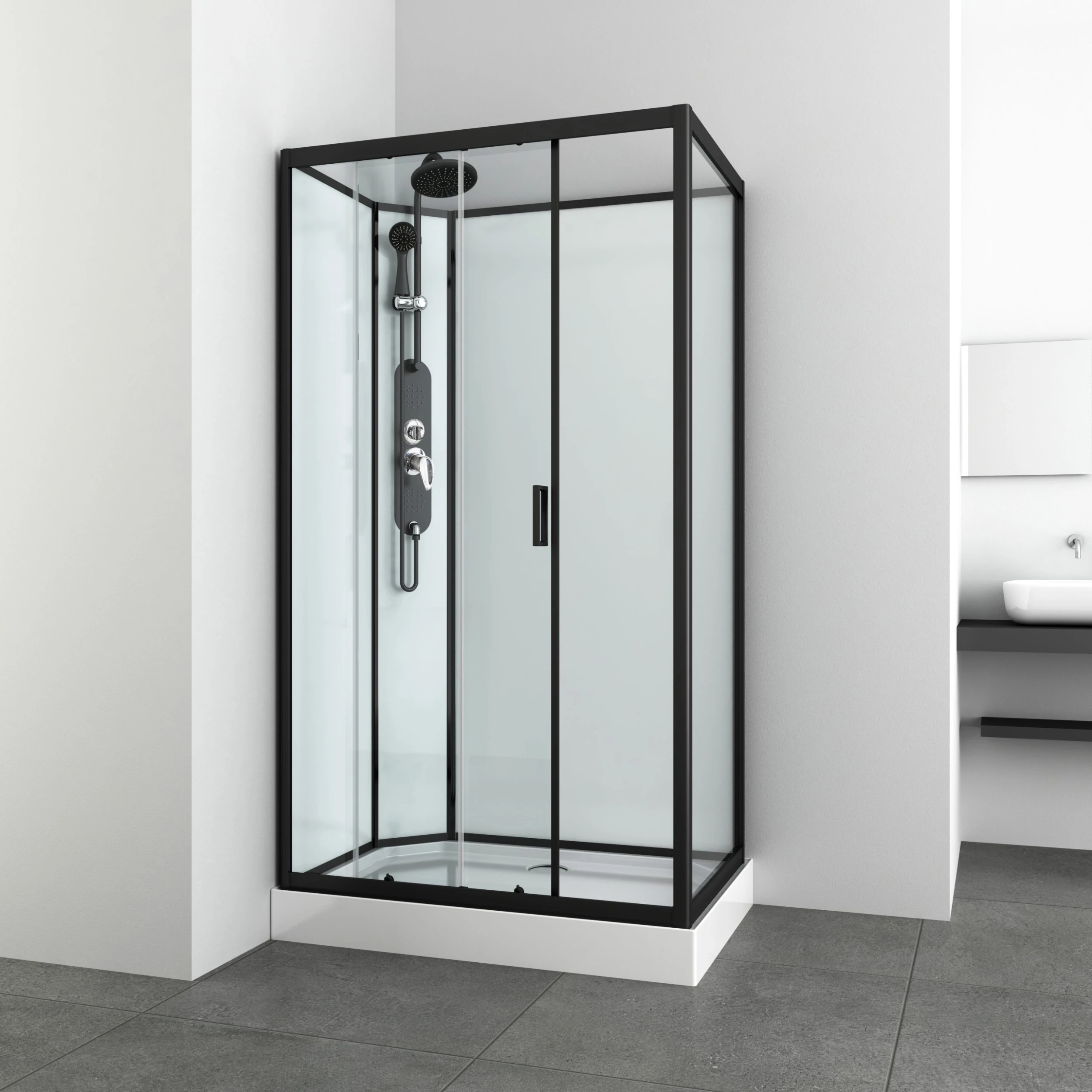 Duschkabine mit Quickline Schnellmontage (ohne Schrauben und ohne Silikon); 5mm Sicherheitsglas Tür und Glasfixteil Klarglas; 4mm Glasrückwand weiß; Kopfbrause; Alu-Profile schwarz matt; Alu-Rahmen für Glaspaneel; Griffe in schwarz; Doppelrollen; 3fach verstellbare Handbrause; Massagedüsen; Brausetasse 14cm hoch; ohne Dach; Massagepaneel links und rechts montierbar