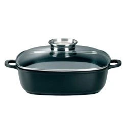 Dieser schlichte Schlemmerbräter im von SSW aus hochwertiger Aluminum-Qualität eignet sich für scharfes Anbraten von Schmorgerichten, Braten, Steaks oder Koteletts. Der Bräter ist besonders energiesparend und kann auf allen gängigen Herdarten genutzt werden, auch Induktion. Ein weiteres Highlight ist der Glasdeckel mit einem Aroma-Knopf zum praktischen Hinzufügen von Flüssigkeiten während des Kochvorgangs.
