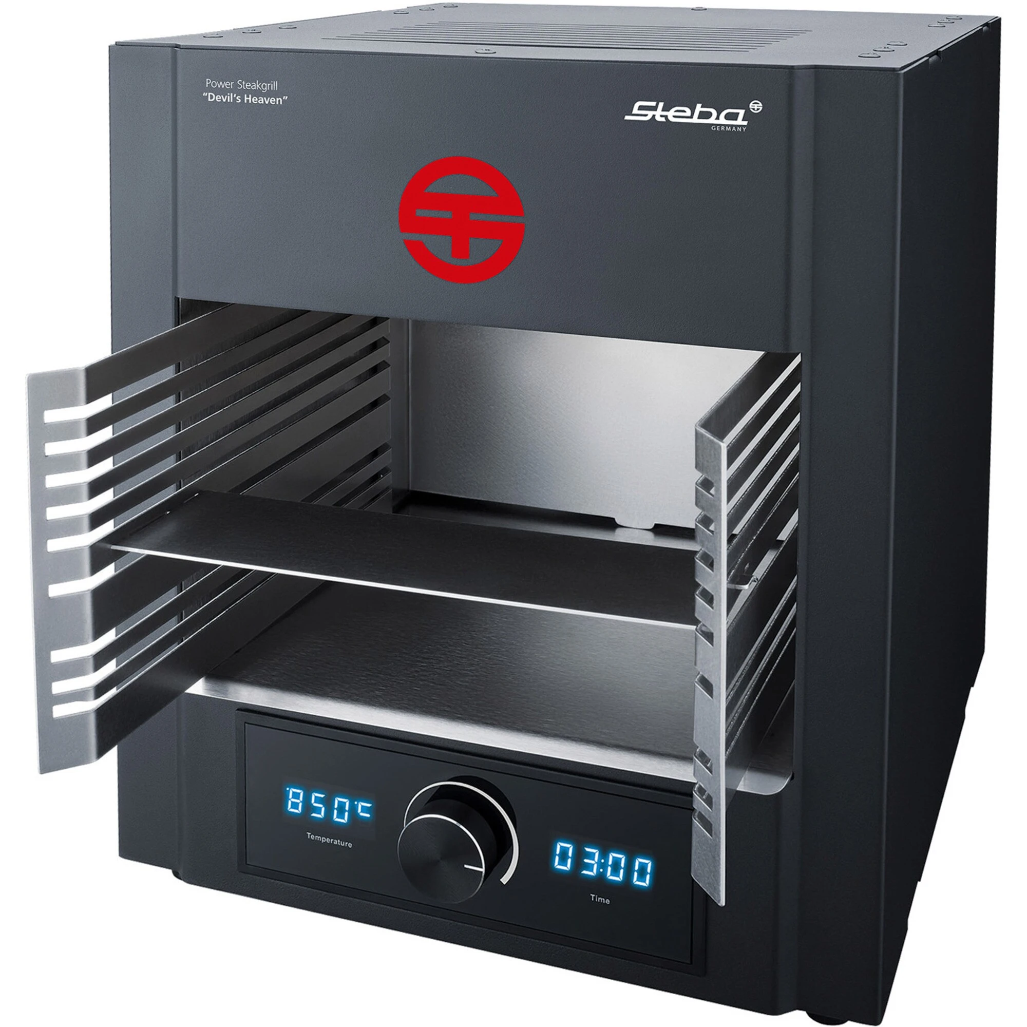 Der Steba Steakgrill PS M2000 Devil’s Heaven ist ein Highlight für jeden Grill- und Fleischliebhaber. Im großen Garraum gelingen bei bis zu 850°C herrlich zarte Steaks, Fisch und andere Grillgerichte. Durch die intensive Hitze bekommt das Grillgut in Minutenschnelle eine knusprige Kruste mit Röstaromen, und das Innere bleibt noch saftig und zart. Die stufenlose elektronische Temperaturregelung von 400°C bis 850°C bietet auch die Möglichkeit, bei niedrigeren Temperaturen z.B. Speisen zu Überbacken. Der entnehmbare Edelstahl-Einschubrahmen bietet neun verschiedene Einschubebenen für die Grillplatte aus Edelstahl. Der Steakgrill PS M2000 Devil’s Heaven hat mit 2.000 Watt ausreichend Power und die wichtigen Daten wie Temperatur und Zeit sind vorne am Display leicht ablesbar. Die gewünschte Temperatur lässt sich zwischen 400°C und 850°C stufenlos einstellen, und der Timer kann für bis zu 99:59 Minuten programmiert werden. Dank der integrierten Kühlung des “Cool-Touch” Gehäuses verbrennt man sich beim Grillen nicht die Finger.