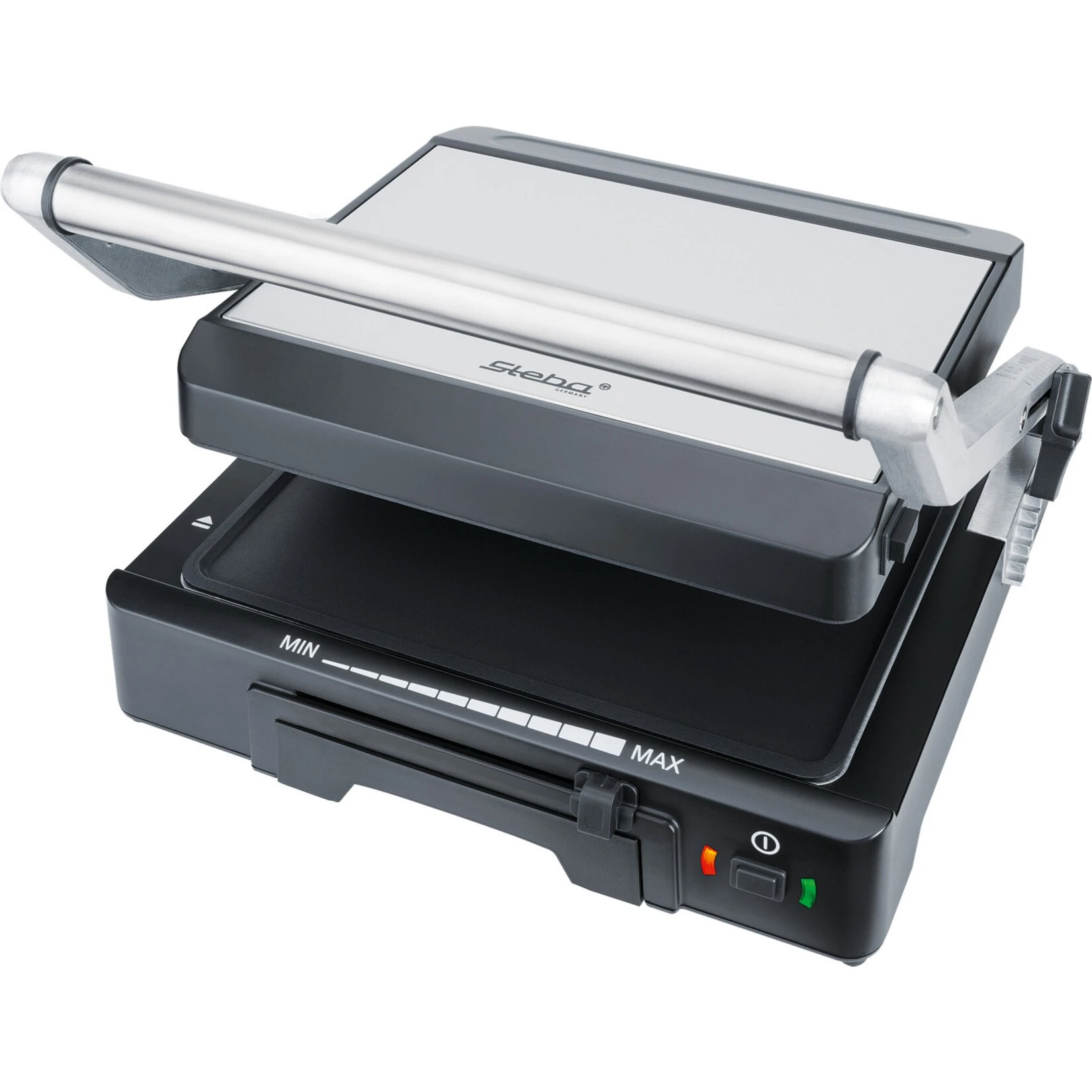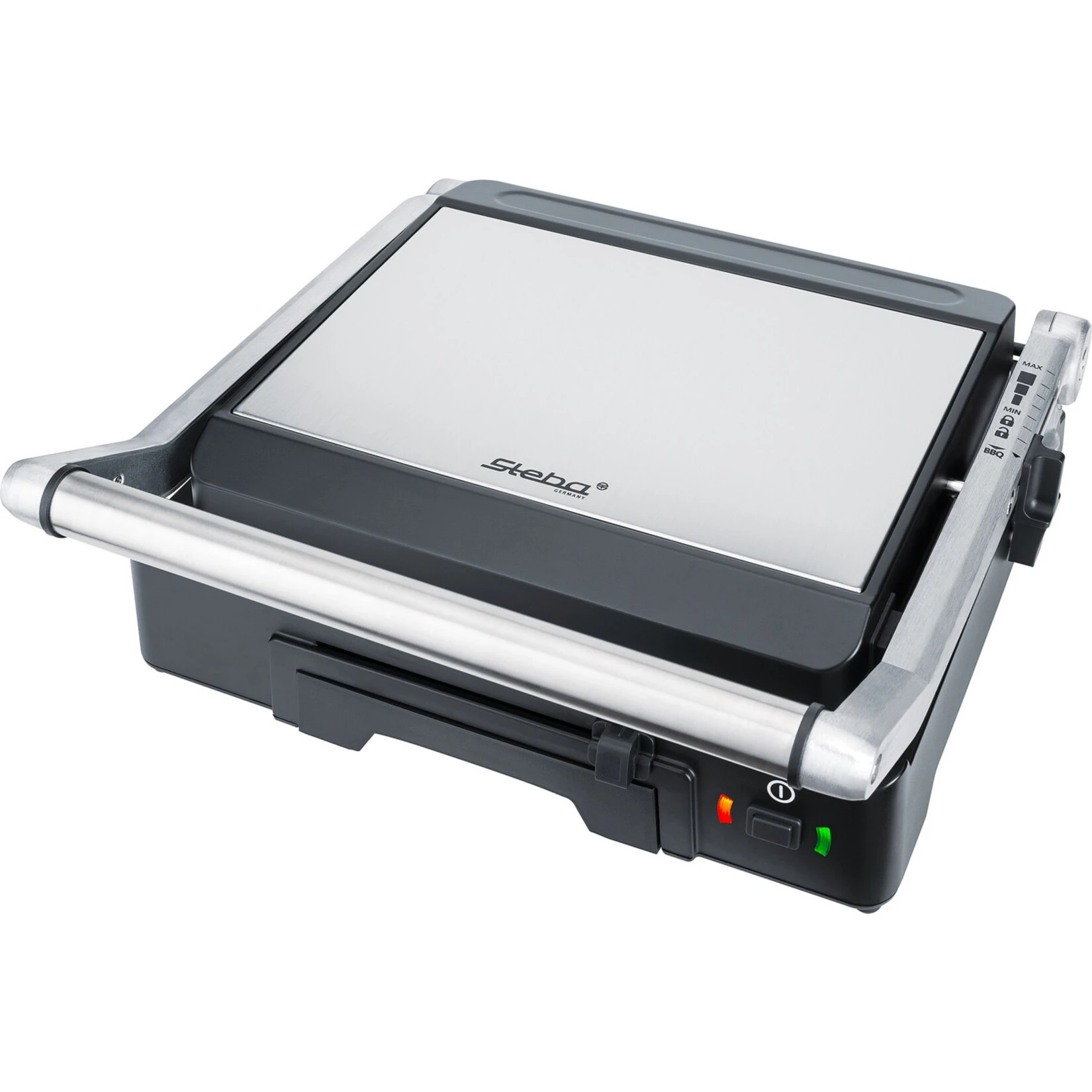 Der Kontaktgrill Steba FG70 Cool Touch wird mit einer Leistung von 1.800 Watt sehr schnell heiß und kommt auf einer Grillfläche von zweimal 27x24cm auch mit größeren Mengen Grillgut zurecht. Dank Antihaftbeschichtung kann man auf den beiden Grillplatten ohne Öl oder Fett Speisen gesund zubereiten. Dennoch steht dem FG70 Cool Touch auch eine Fettauffangschale zur verfügung. Der stufenlos regelbare Thermostat sowie die Verriegelungsfunktion für eine senkrechte Aufbewahrung machen die Bedienung für den Anwender besonders einfach.