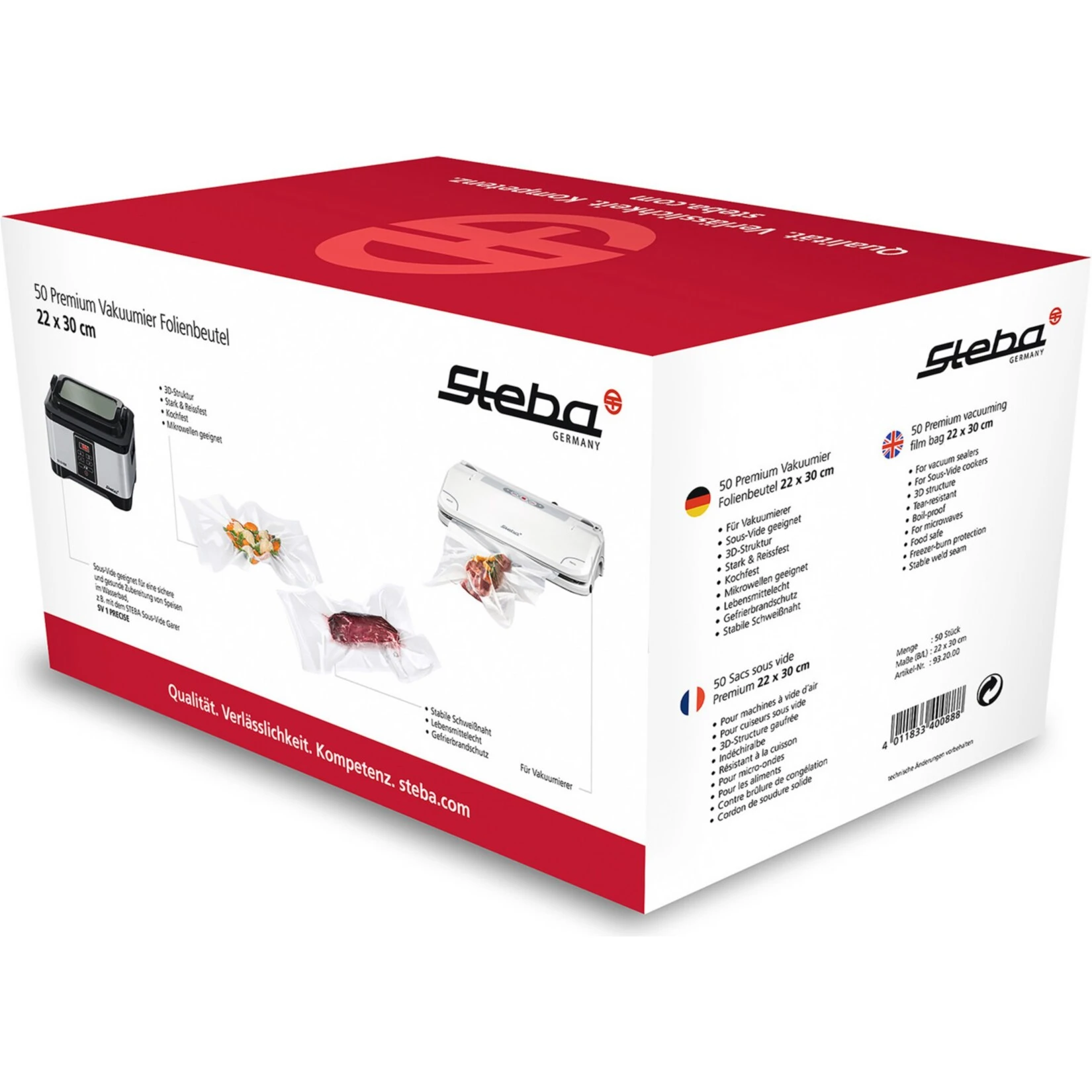 Die Premium Vakuumier-Folienbeutel 932000 von Steba schützen vor Gefrierbrand, und die Lebensmittel bleiben um ein Vielfaches länger frisch. Sie sind für alle handelsüblichen Vakuumierer geeignet, und ideal für die (STEBA-) Sous-Vide Garer. Die 3D-Struktur sorgt für optimales Vakuumieren, die Folienbeutel sind außerdem lebensmittelecht und haben stabile Schweißnähte.