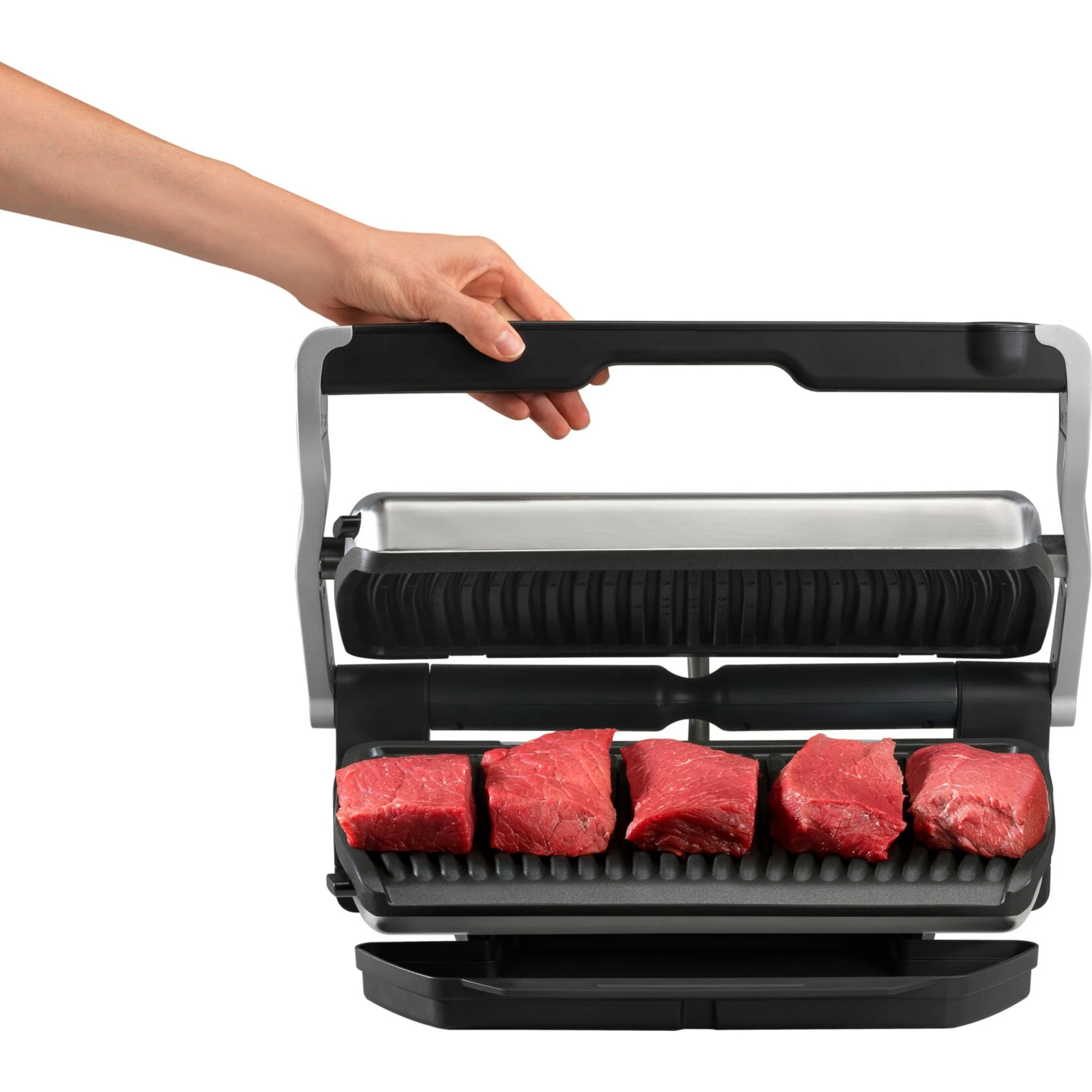 Bei der Innovation von Tefal, dem OptiGrill+ XL, sorgt intelligente Technologie für köstliche Garergebnisse. Mit einer großen Grillfläche für sechs bis acht Personen ist er ideal zum Grillen mit Familie und Freunden. Inklusive der Technologie “Automatic Sensor Cooking”: Garzeit und -temperatur werden auf Grundlage von 9 Garprogrammen (Burger, Steaks, Sandwiches, Würstchen, Fisch, Geflügel, Meeresfrüchte, Schweinefleisch und Bacon) automatisch je nach Dicke und Menge des Grillguts reguliert. Zusätzlich gibt es einen Modus zum Auftauen von Gefriergut. Eine direkte Überwachung ist über den Lichtindikator möglich: Violett für Vorwärmen, blau, dann grün zum Garbeginn, gelb, wenn das Grillgut blutig gebraten ist, orange für medium und rot für durchgebraten. Auf den Punkt für jeden Geschmack! Einfach den Deckel anheben und das Fleisch herausnehmen, wenn es fertig ist. Der Rest kann weiter garen! Mit dem zusätzlichen manuellen Modus mit 4 regulierbaren Temperaturen kann man verschiedenste Lebensmittel, Früchte und Gemüse, genau so zubereiten, wie es einem schmeckt. Bei diesem Modell ist die Menüsprache Deutsch evtl. nicht einstellbar.
