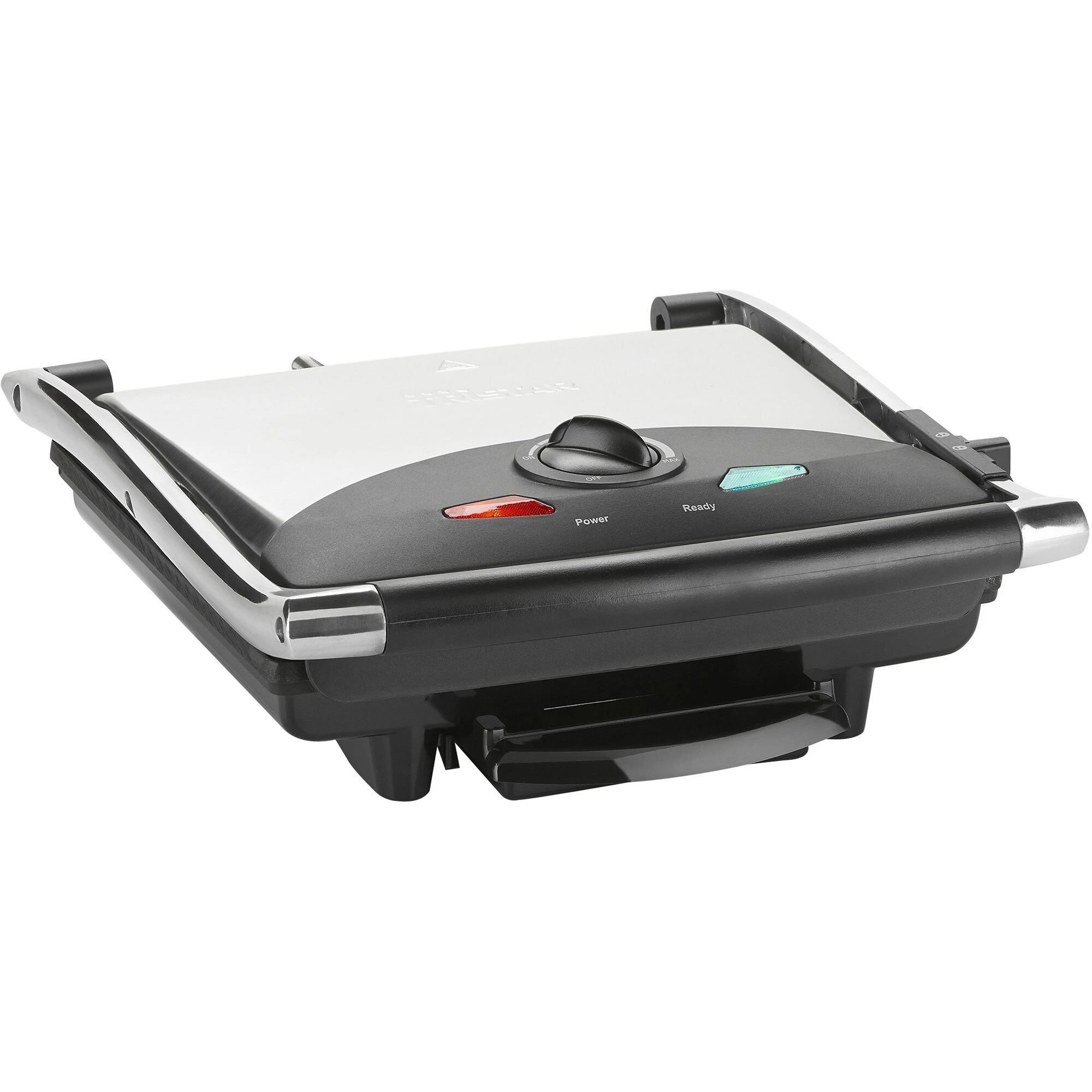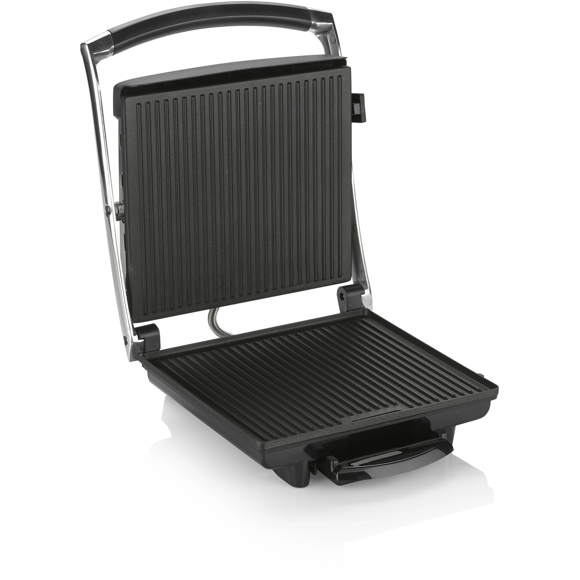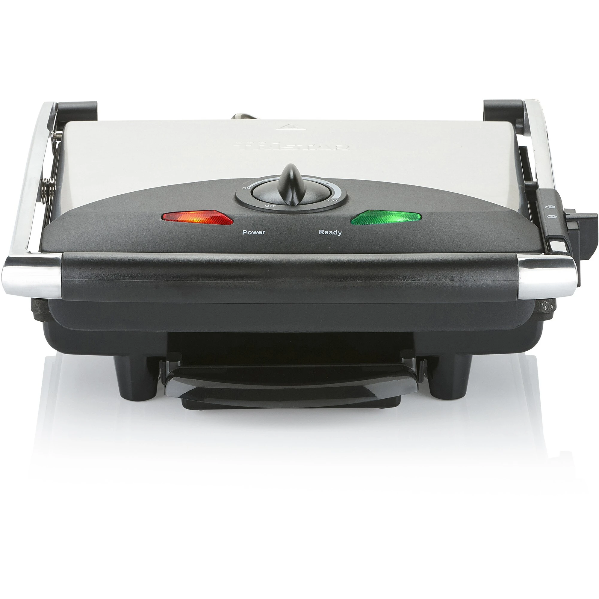 Der Tristar GR-2848 Kontaktgrill ist ein eleganter und robuster Grill, mit dem sich jedes Produkt im Handumdrehen zubereiten lässt. Er ist perfekt zum Zubereiten von gegrillten Sandwiches und Panini, aber auch zum Grillen von Fleisch, Fisch und Gemüse geeignet. Der Kontaktgrill ist mit einem beweglichen Deckel ausgestattet, wodurch er für ganz unterschiedliches Grillgut verwendet werden kann. Dickere Produkte werden nicht zusammengedrückt, und alle Zutaten werden gleichmäßig gegart. Der Grill hat ein Thermostat, mit dem für jedes Grillgut die richtige Temperatur eingestellt werden kann. Der GR 2848 ist mit einem integrierten Fett-Abtropf-System. Das Fett läuft in einen Fettauffangbehälter ab, sodass das Gericht weniger Fett enthält und gesünder ist. Außerdem hat der Grill eine hochwertige Antihaftbeschichtung, die Öl oder Butter überflüssig macht. An der Kontrolllampe kann man auf einen Blick erkennen, ob der Grill eingeschaltet ist und die richtige Temperatur erreicht ist, und mit den Anti-Rutsch-Füßen steht er sicher auf der Arbeitsfläche.