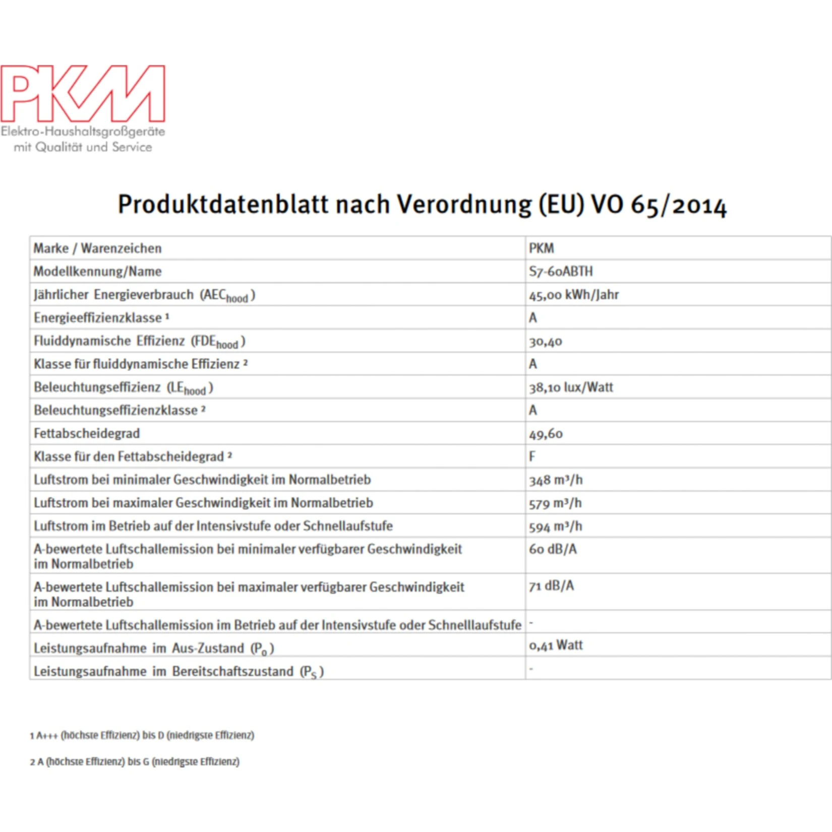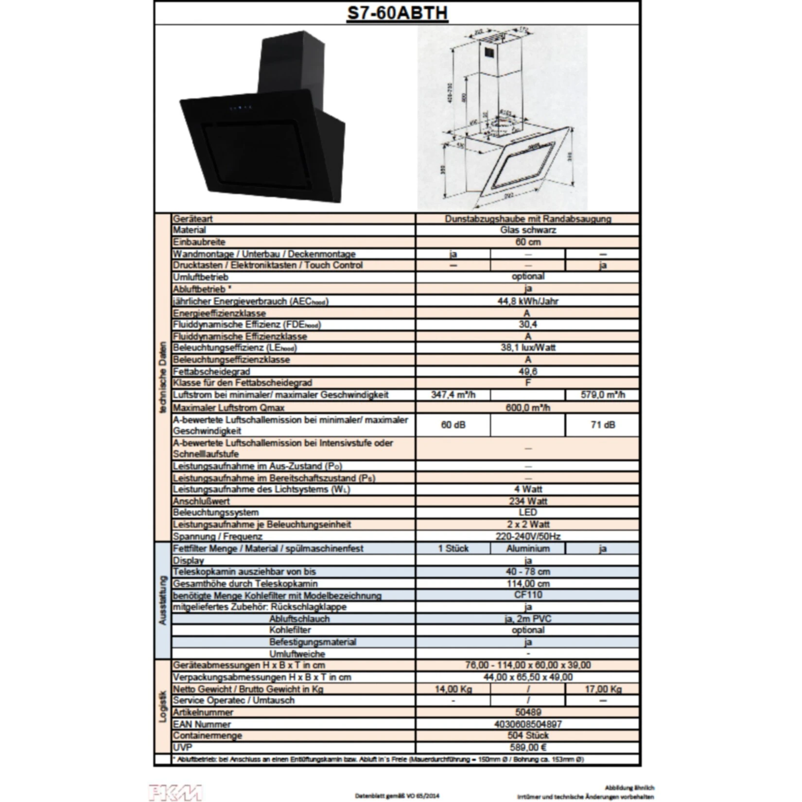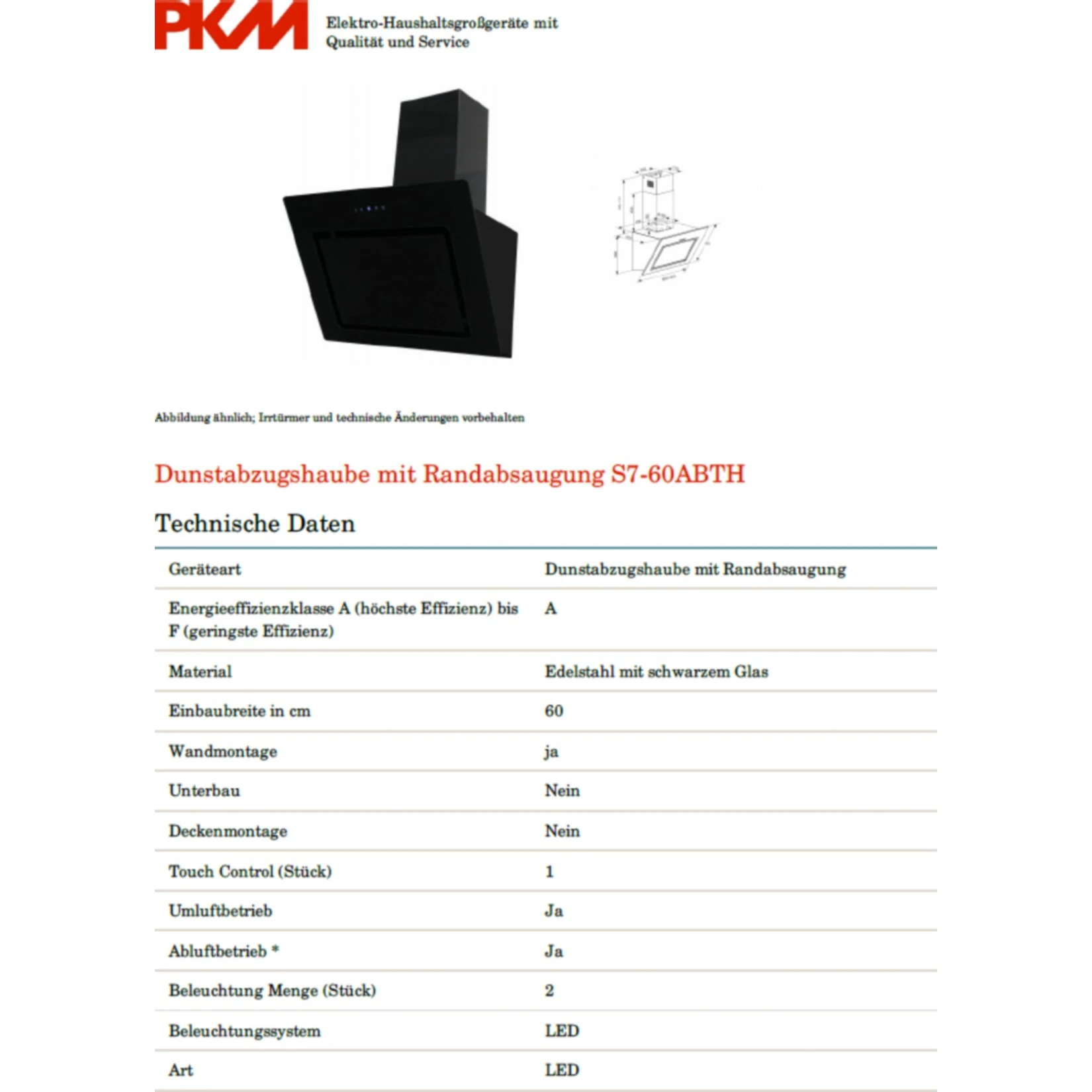 PKM S7-60ABTH Dunstabzugshaube 60cm schwarzes Glas + Aktivkohlefilter CF110