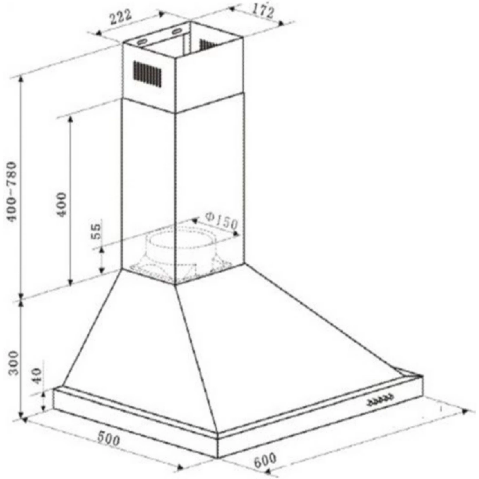 Kamin-Dunstabzugshaube aus Edelstahl mit 2 waschbaren Metallfettfiltern (Spülmaschinenfest).