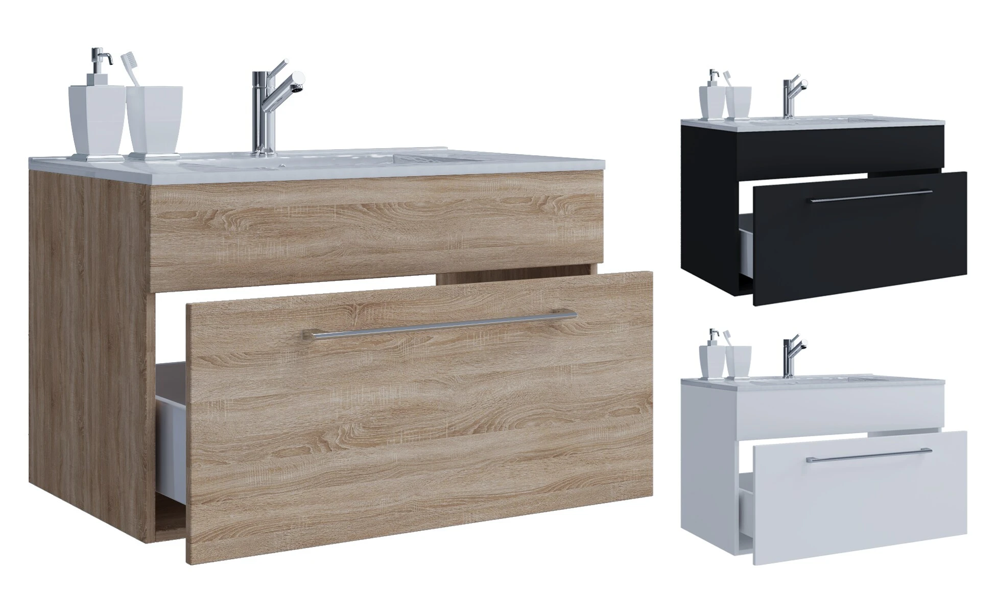Das Badmöbel-Set besteht aus einem Unterschrank mit einer leichtgängigen Schublade mit Metallauszügen.