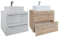 Der Designer hat bei dem Badmöbel-Set auf eine zeitlose Optik mit großem Nutzen geachtet. Zwei leichtgängige Schubladen mit gut nutzbaren Griffen bieten ausreichend Stauraum. Das elegante Aufsatzwaschbecken ist aus Keramik und damit besonders widerstandsfähig. Dank der Melamin Beschichtung sind die Badmöbel besonders pflegeleicht und unempfindlich gegenüber Feuchtigkeit.