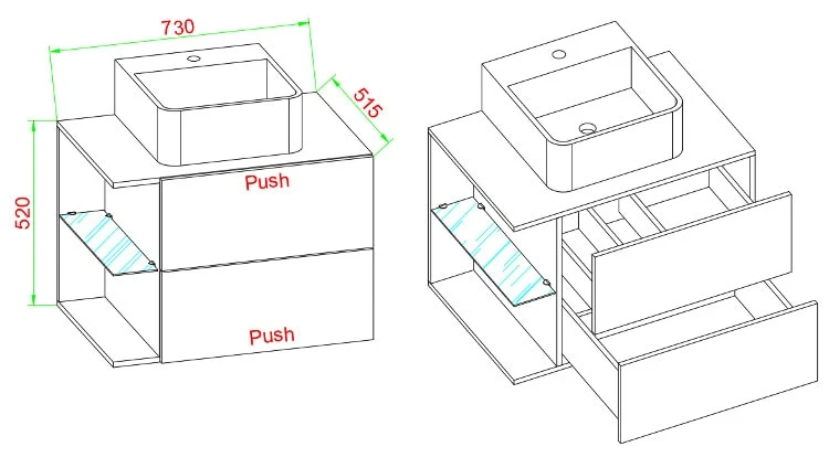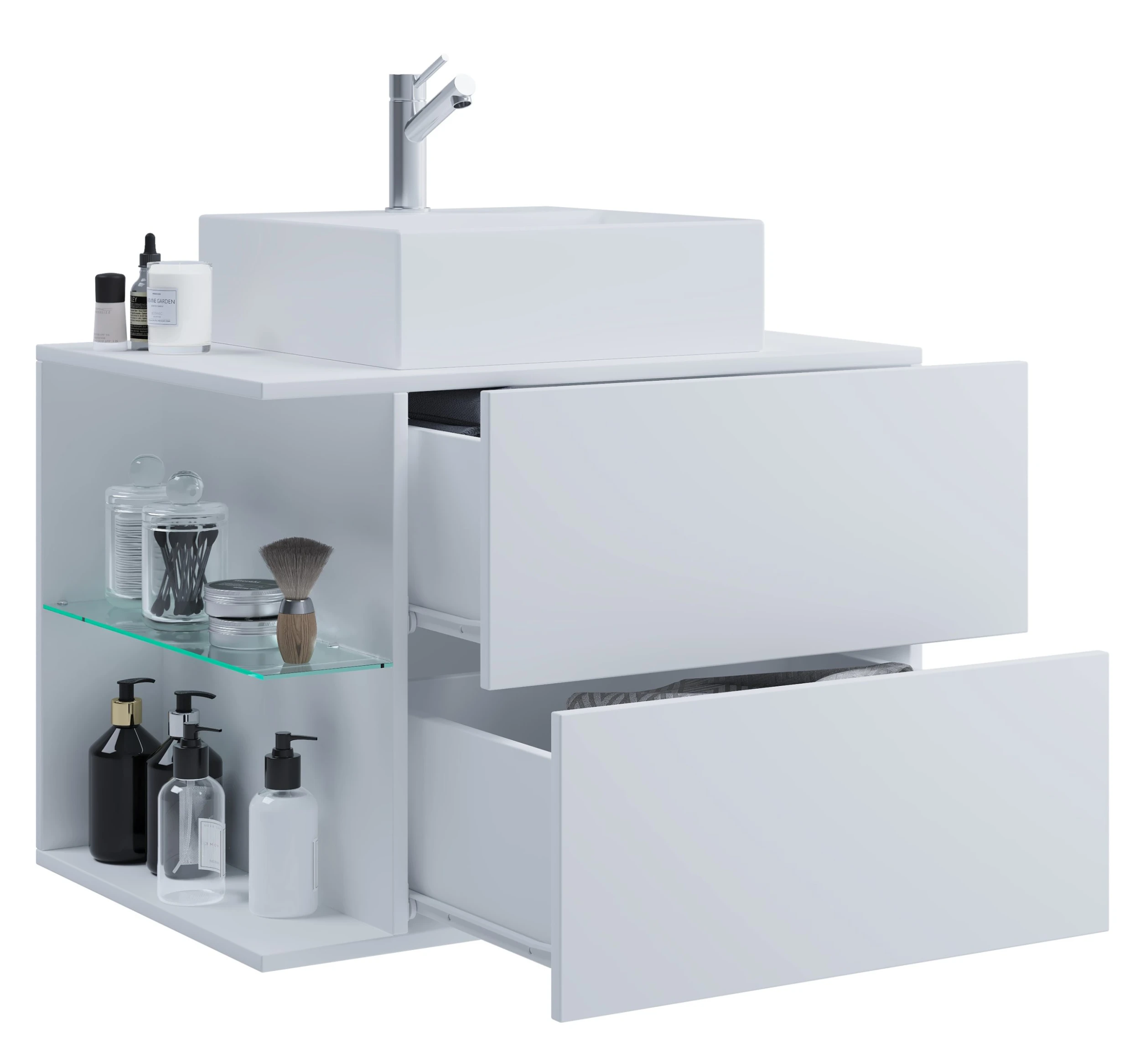 Der Waschbeckenunterschrank wirkt durch die offenen Seitenfächer und dem Glasboden besonders elegant. Die Schubladen mit der push-to-open Funktion sind ebenso ein absolutes Highlight.