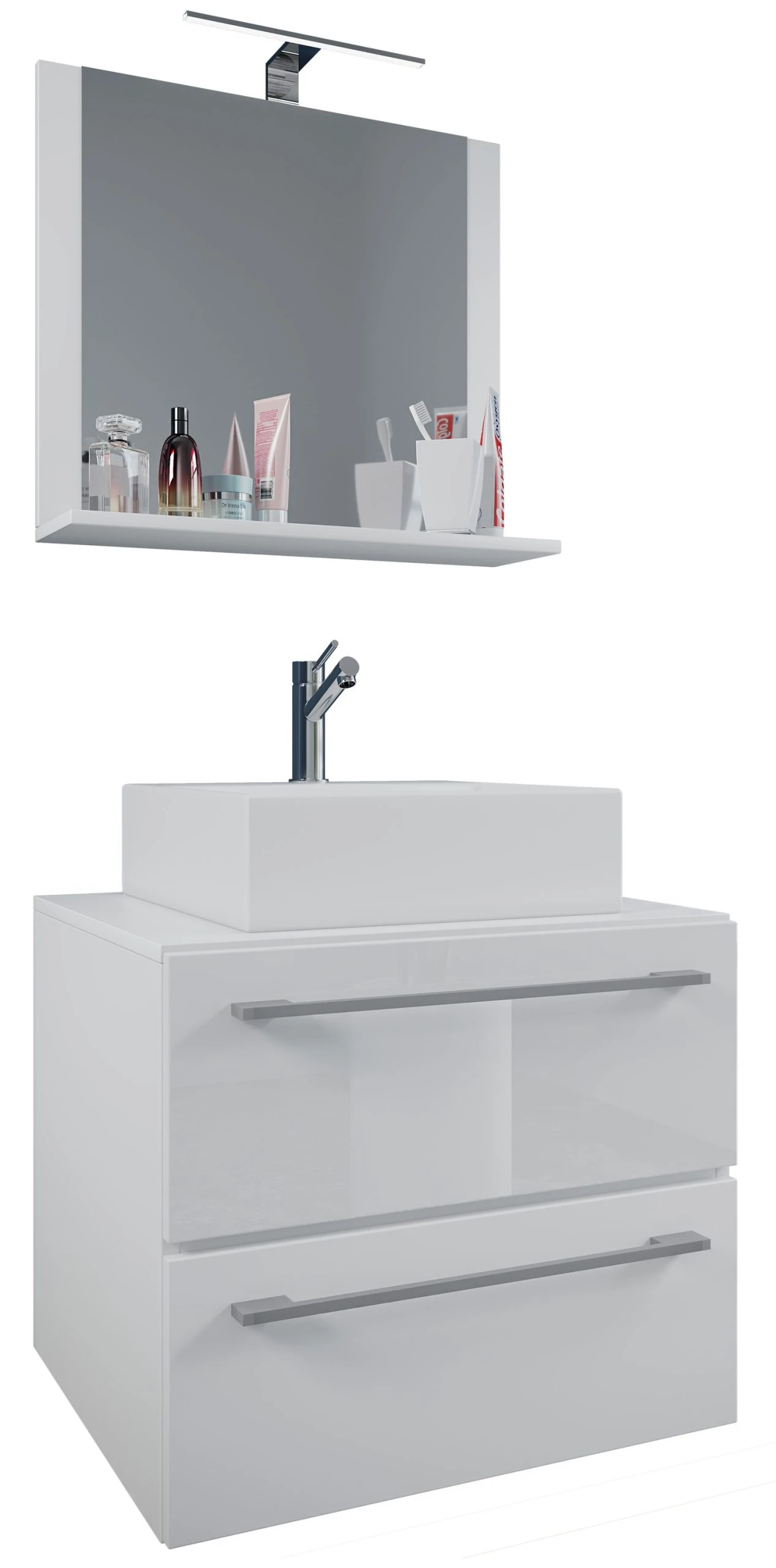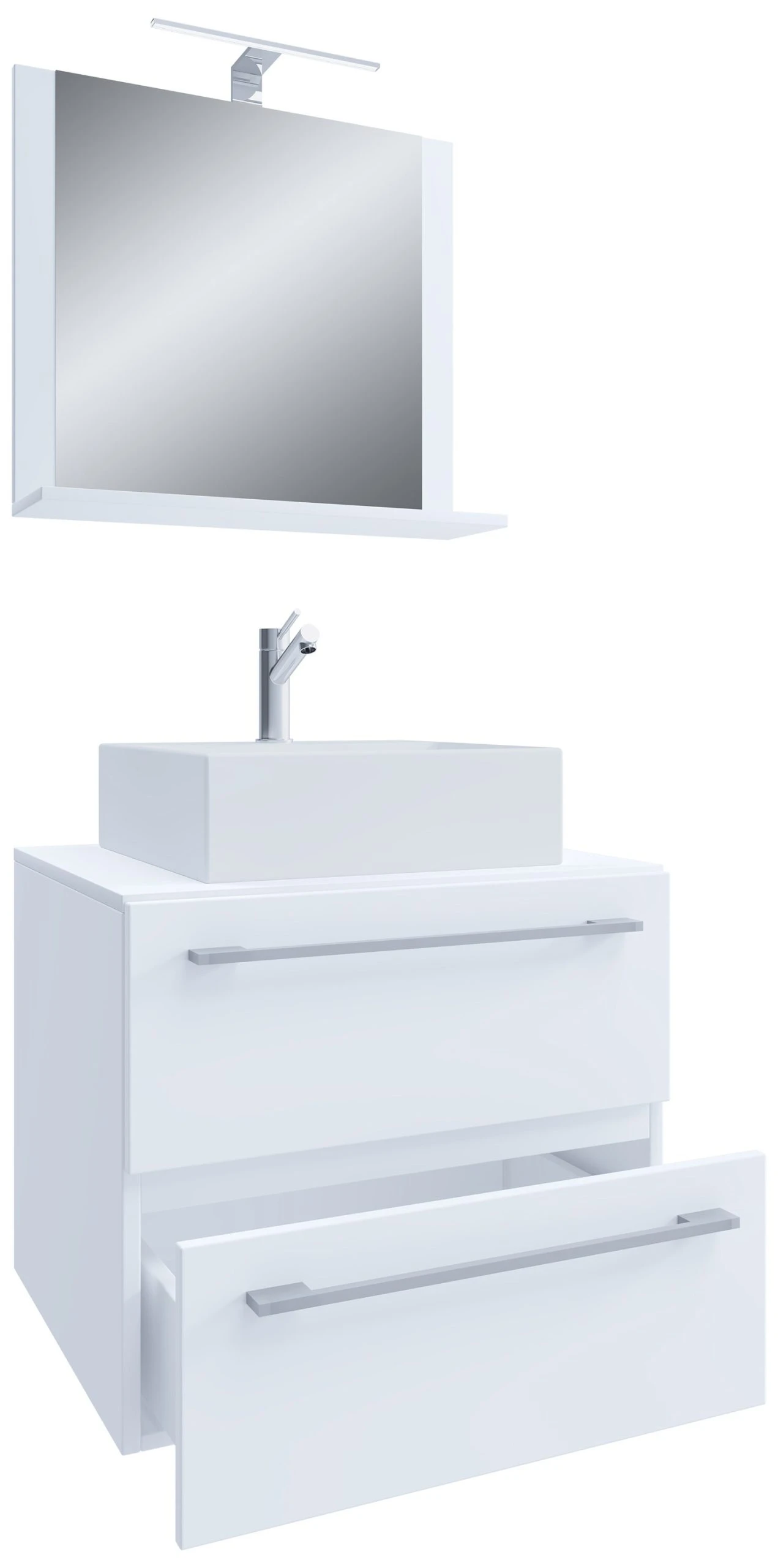 Der Designer hat bei dem Badmöbel-Set auf eine zeitlose Optik mit großem Nutzen geachtet. Zwei leichtgängige Schubladen mit gut nutzbaren Griffen bieten ausreichend Stauraum. Das elegante Aufsatzwaschbecken ist aus Keramik und damit besonders widerstandsfähig. Der Spiegel bietet eine praktische Ablage für Deko oder Badutensilien. Dank der Melamin Beschichtung sind die Badmöbel besonders pflegeleicht und unempfindlich gegenüber Feuchtigkeit.
