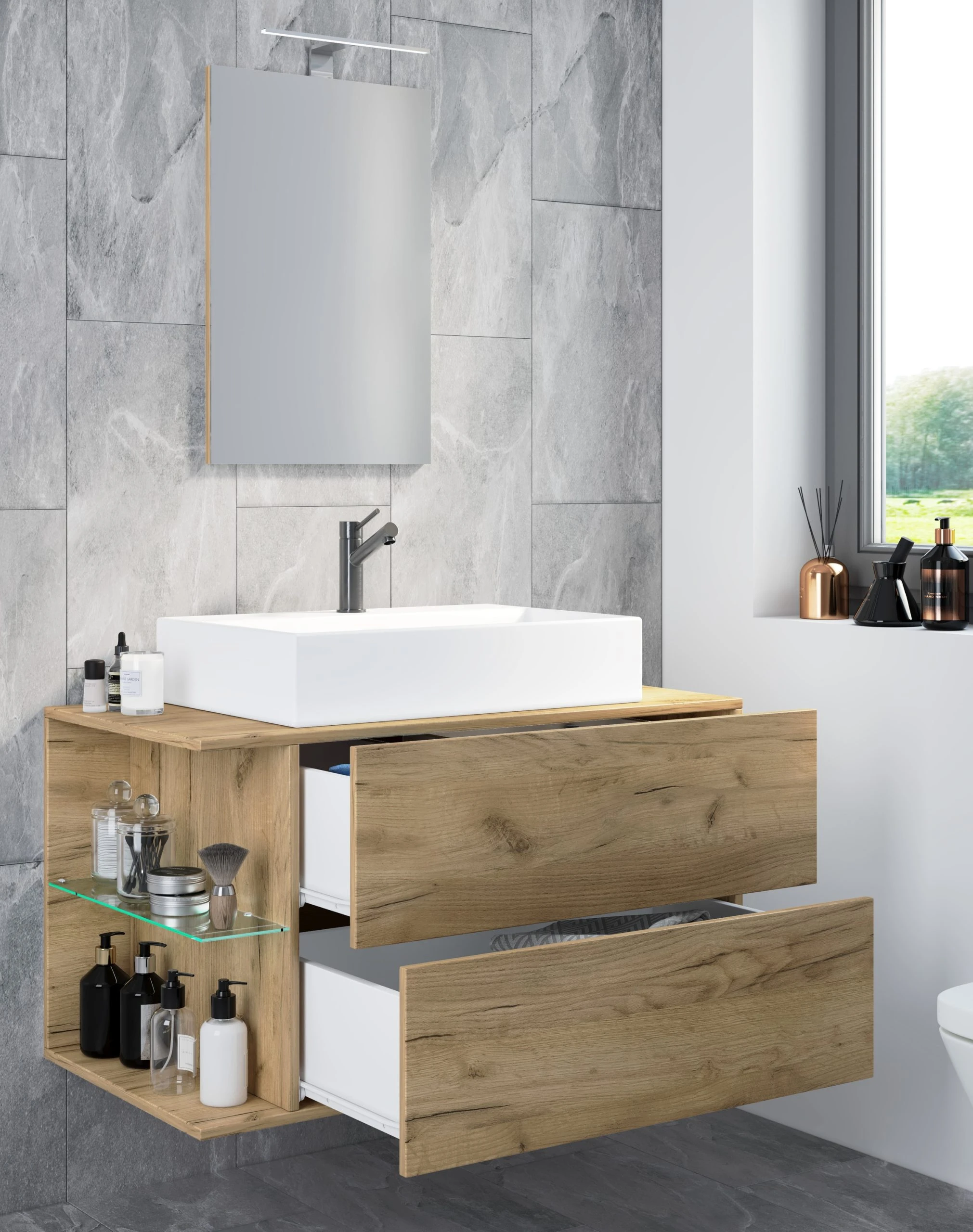 Der Waschbeckenunterschrank wirkt durch die offenen Seitenfächer und dem Glasboden besonders elegant. Die Schubladen mit der push-to-open Funktion sind ebenso ein absolutes Highlight.