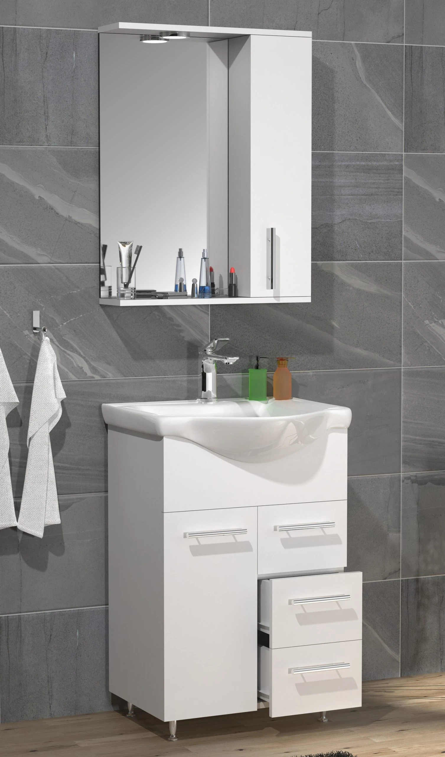 Das Badmöbelset kann mit weiteren Badmöbeln der Serie “Lisalo” ergänzt werden.