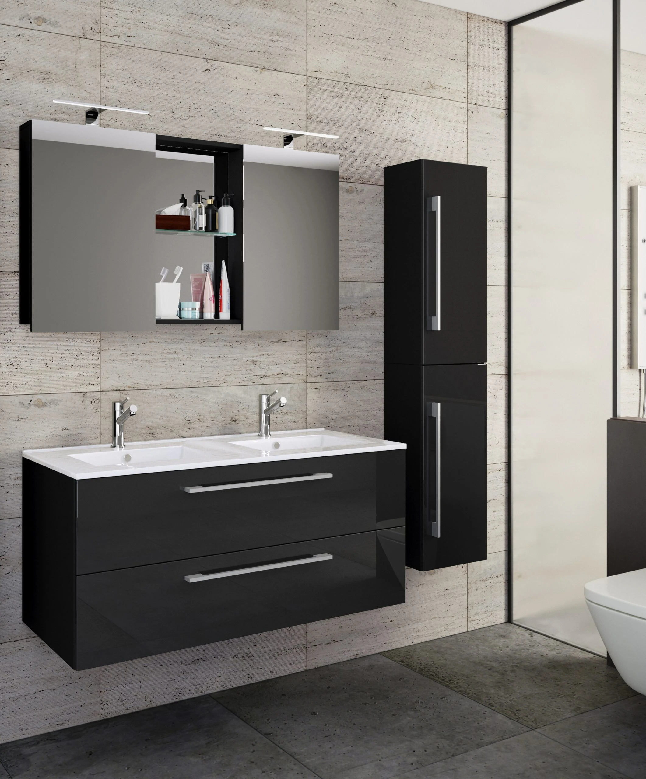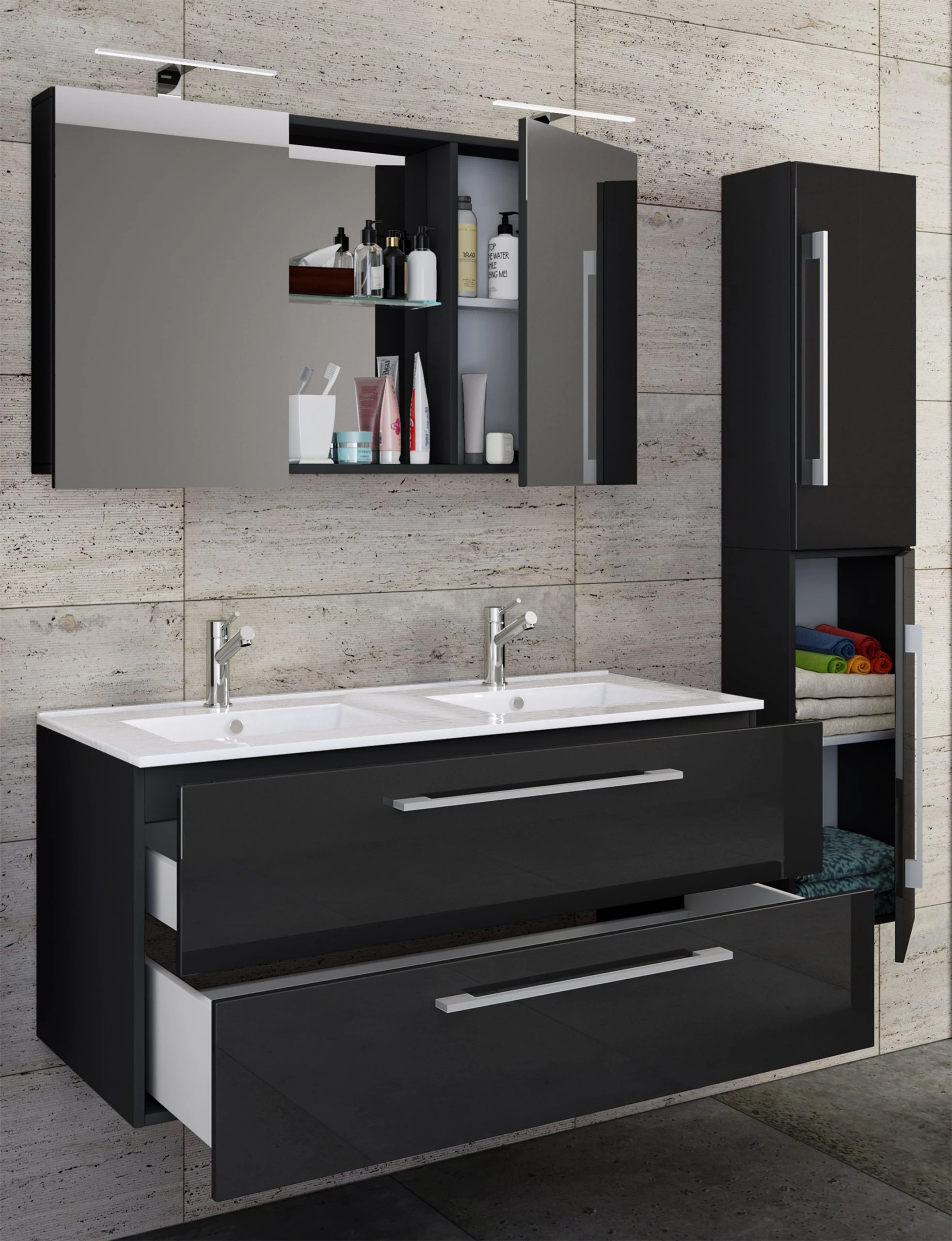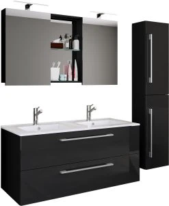 Das VCM Badmöbel-Set “Budasi” besteht aus einem Unterschrank mit zwei Schubladen auf robusten Metallschienen, einem Spiegelschrank mit zwei Türen sowie einem Hochschrank mit zwei Türen und vier Fächern. Als Eyecatcher dient das moderne Doppelwaschbecken aus massiver Keramik, das Ihrem Badezimmer ein ganz besonderes Ambiente verleiht.
