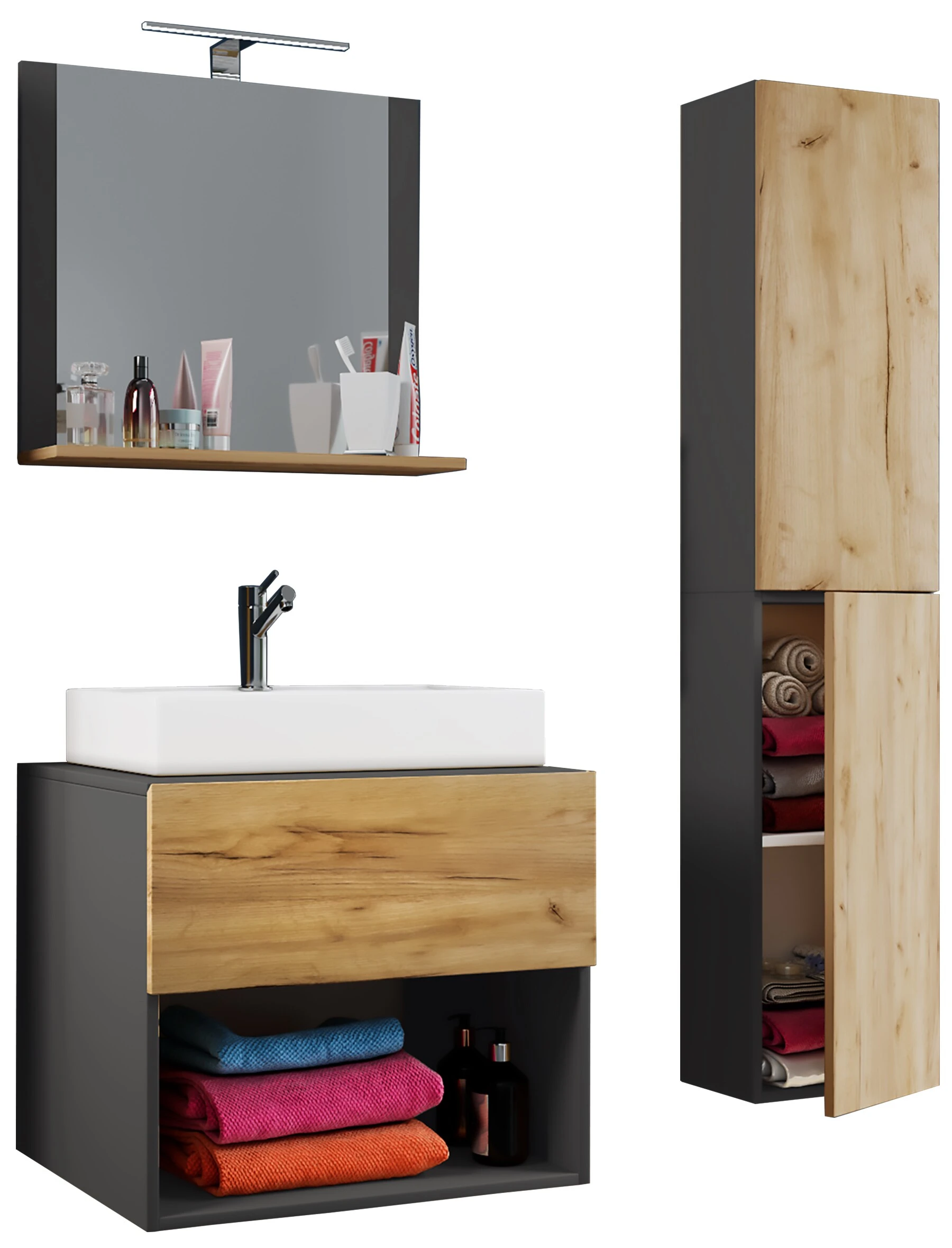 Das 4-tlg. Badmöbelset kann mit weiteren Badmöbeln aus der Serie “VCM Lendas” und der Beleuchtung “VCM Blino” kombiniert werden.