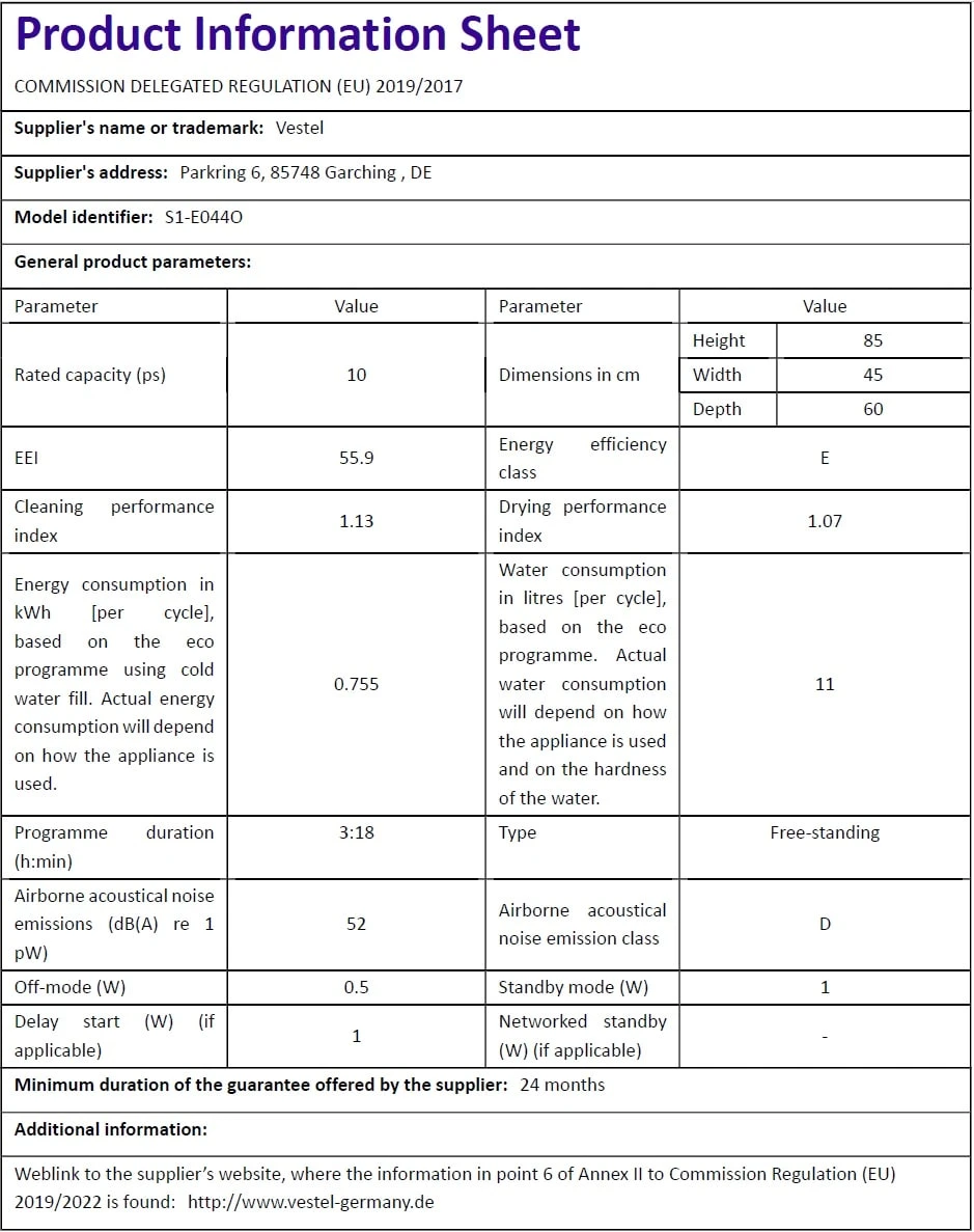 Vestel Geschirrspüler 45cm weiß freistehend
