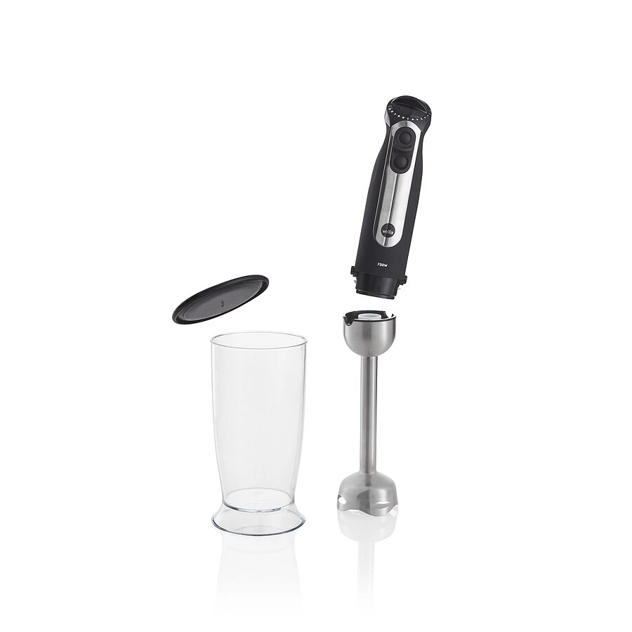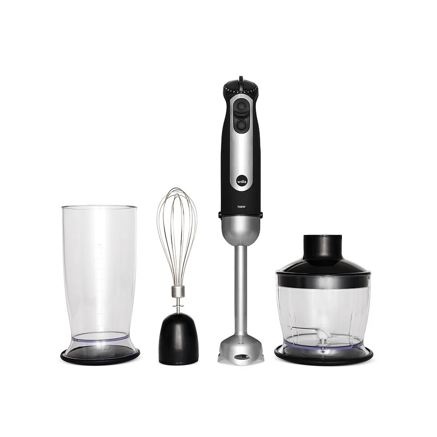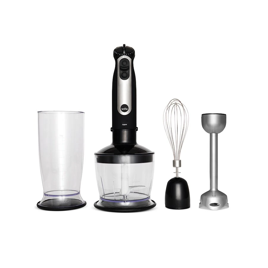 Ein Stabmixer ist eines der vielseitigsten Produkte in der Küche. Mit ihm lassen sich Suppen, Pürees, Kindernahrung und vieles mehr leicht zubereiten. Der Wilfa Stabmixer SM1FP verfügt über einen leistungsstarken 700-Watt-Motor, der unabhängig vom Widerstand ein gleichmäßiges Mischen der Zutaten ermöglicht. Dank des gummierten Griffes vermeiden Sie eine rutschige Handhabung, etwa wenn Sie nasse Hände haben. Darüber hinaus können Sie mit dem stufenlosen Geschwindigkeitsregler immer die richtige Geschwindigkeit für Ihre Lebensmittel einstellen. Das Produkt wird einschließlich eines Mischgefäßes geliefert, in dem Sie messen können, was Sie zubereiten. Da das Gefäß über einen Deckel verfügt, lassen sich Lebensmittel problemlos darin aufbewahren. Zudem sind alle abnehmbaren Teile spülmaschinengeeignet und das kompakte Gerät kann in jeder Küche mühelos verstaut werden.