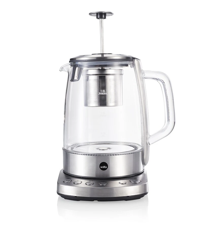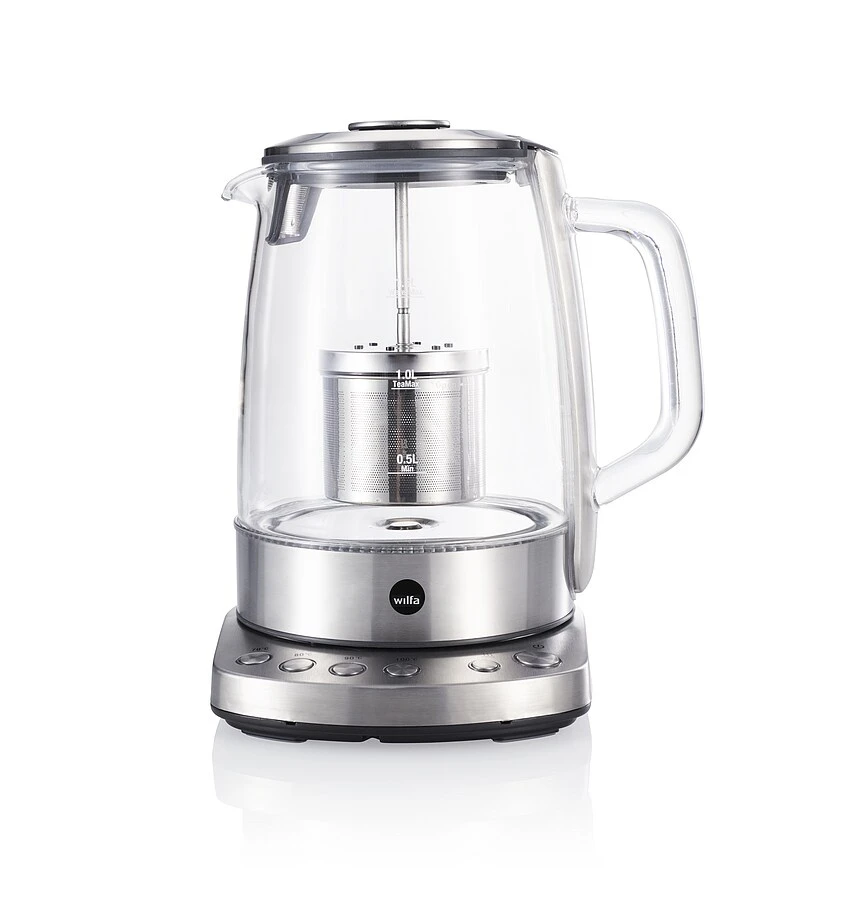Verschiedene Teesorten erfordern unterschiedliche Temperaturen, um perfekt gebrüht zu werden. Mit dem Wilfa CHA Teekocher TM1500S lässt sich passend für den jeweiligen Tee aus 4 Temperatureinstellungen wählen. Das Gerät besitzt ein leistungsstarkes Heizelement mit 2200 Watt. Um den Tee aufzubrühen, müssen Sie nur die richtige Menge Tee in das Sieb geben und das Gefäß anschließend mit dem Deckel zum Aufbrühen schließen. Sobald der Tee fertig gebrüht ist, können Sie ihn direkt aus der Kanne einschenken, was dank des praktischen Servierverschlusses ohne Kleckern möglich ist. Zudem kann die Kanne mit einem extra Deckel zum Servieren verschlossen werden und das Getränk bleibt so länger warm. Das Fassungsvermögen des Teekochers beträgt 1,25 Liter. Aufgrund der Warmhaltefunktion dauert es lange, bis das Getränk abkühlt. Dementsprechend kann der Tee auch nach ein paar Stunden noch warm zu sich genommen werden. Der stylische und hochwertige TM1500S besteht aus Stahl und Glas, was Ihnen ermöglicht, bei der Zubereitung des Tees zuzuschauen.