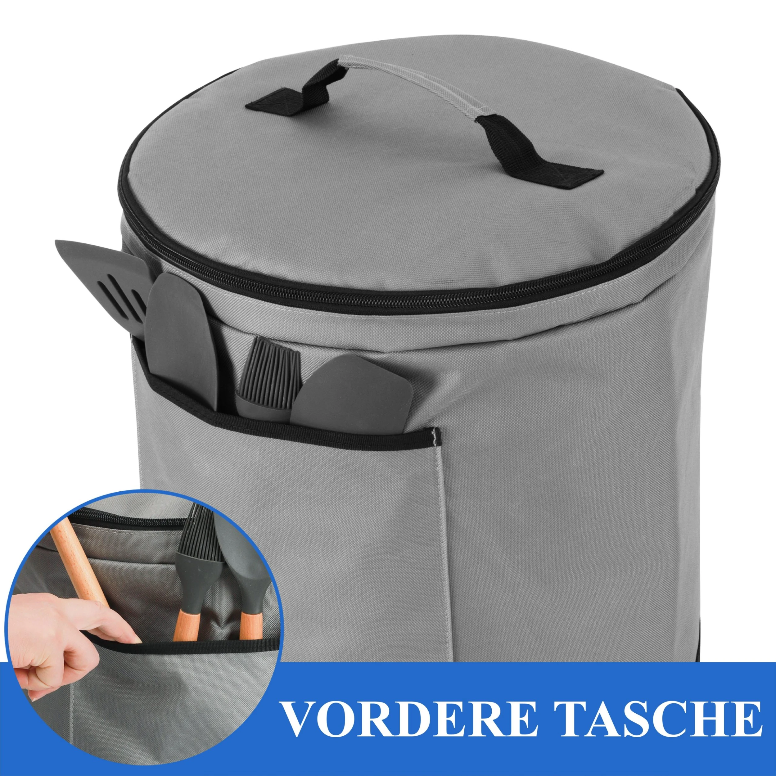- [BIETET PRAKTISCHEN STAURAUM] 2 Taschen sind bei der Schutzhaube inkludiert: oben ist eine kreisrunde Tasche mit Reißverschluss integriert, in die der Deckel des elektrischen Schnellkochtopfs genau hineinpasst – an der Seite ist eine weitere Tasche mit Reißverschluss enthalten: hierin passen Löffel, Kellen, Rezepthefte, schmale Rezeptbücher, die Bedienungsanleitung und andere Dinge, die man im Zusammenhang mit dem elektrischen Schnellkochtopf gut gebrauchen kann